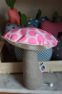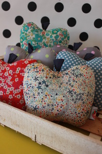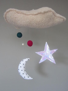 Je suis donc allée jeter un coup d’oeil sur le blog et la boutique en ligne d’Annabel Kern et j’ai découvert un très joli univers, fait de coussins boite à musique, de linge de lit, de hochets, de mobiles, de guirlandes… Le tout dans de jolis tons liberty, pastels, floraux, à pois, avec des étoiles… Des petits nuages, des champignons, des pommes, des poires, des cornets de glace et autres petites merveilles.