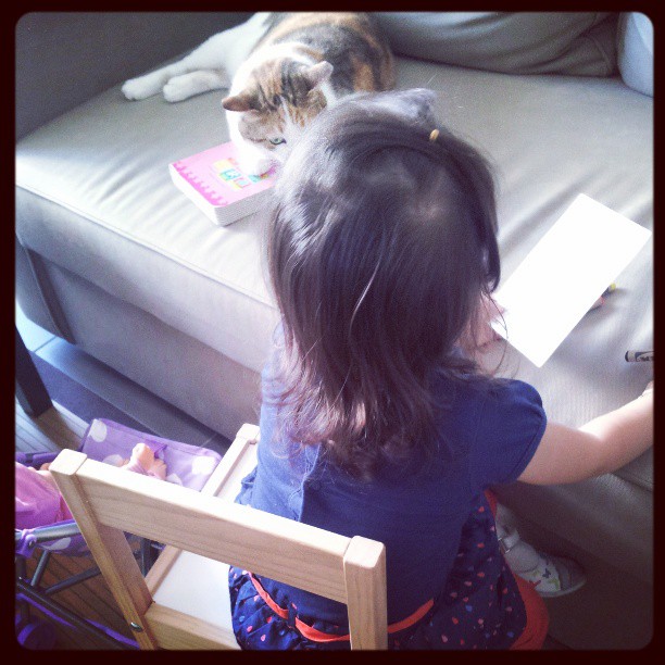 - Liloute a trouvé un nouveau passe temps: faire la lecture au chat ! Pas sûre que ça l’intéresse, mais elle a fait un effort pour la photo…