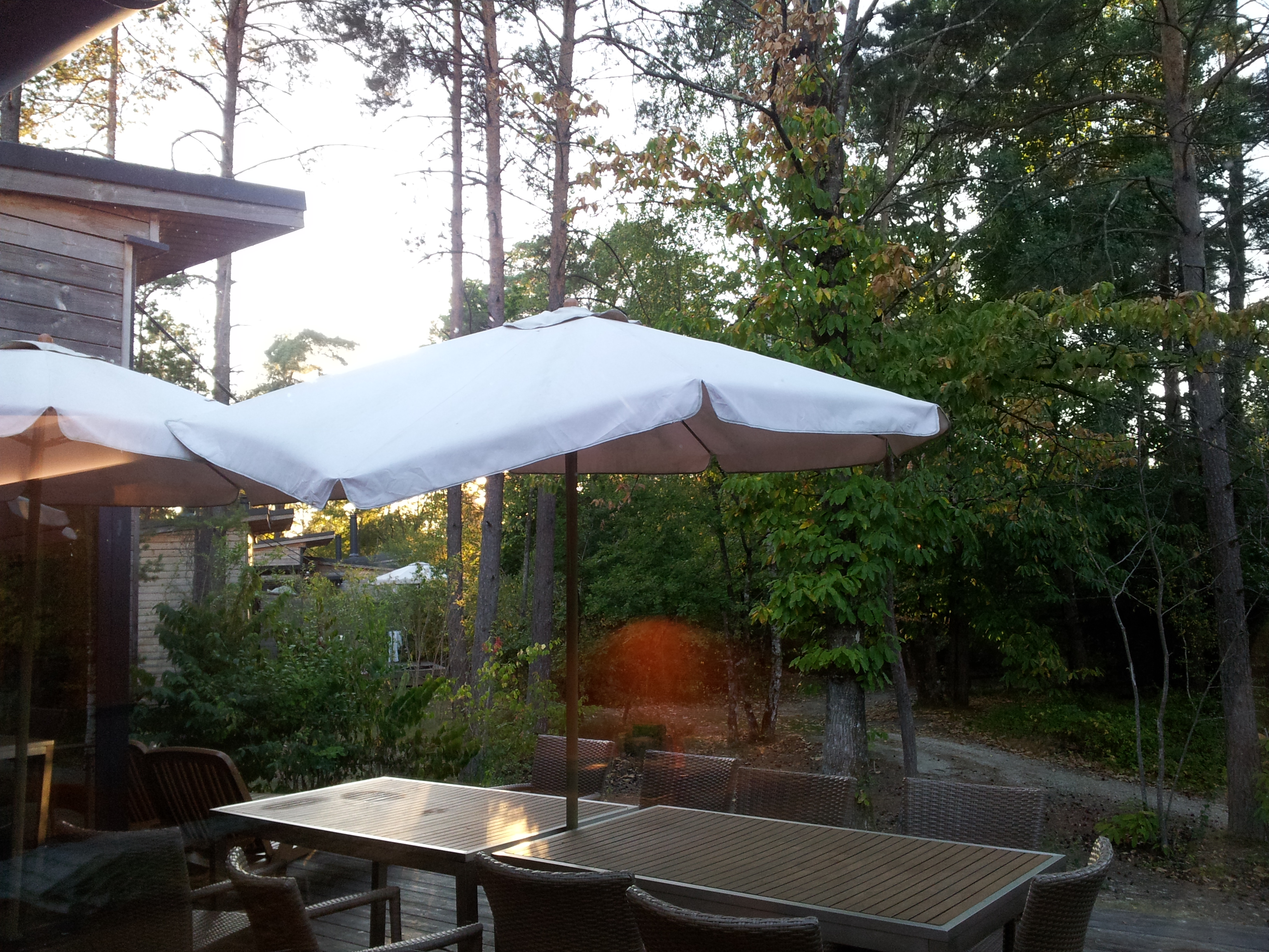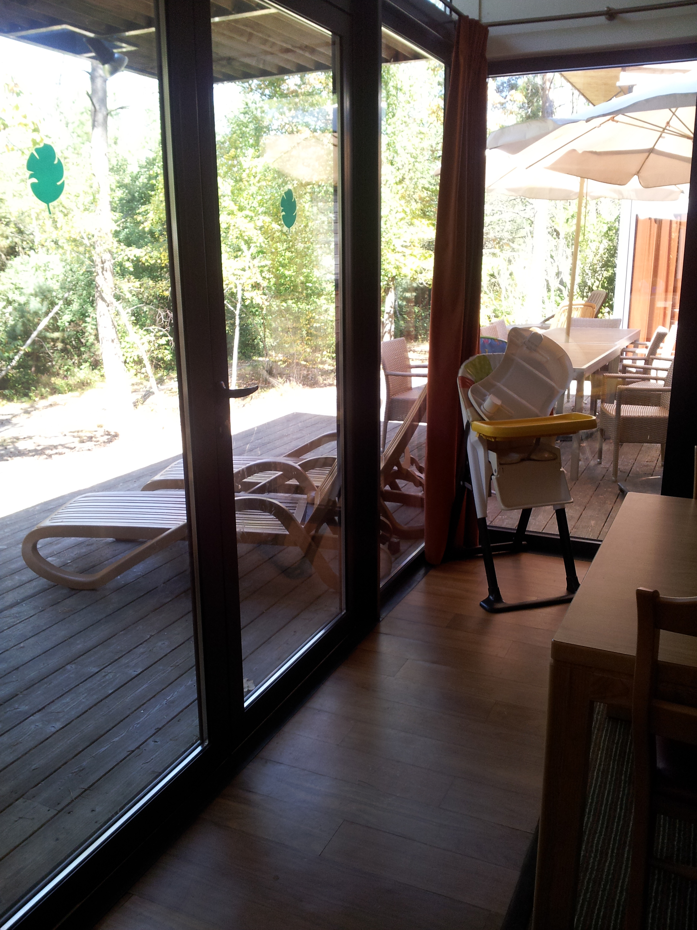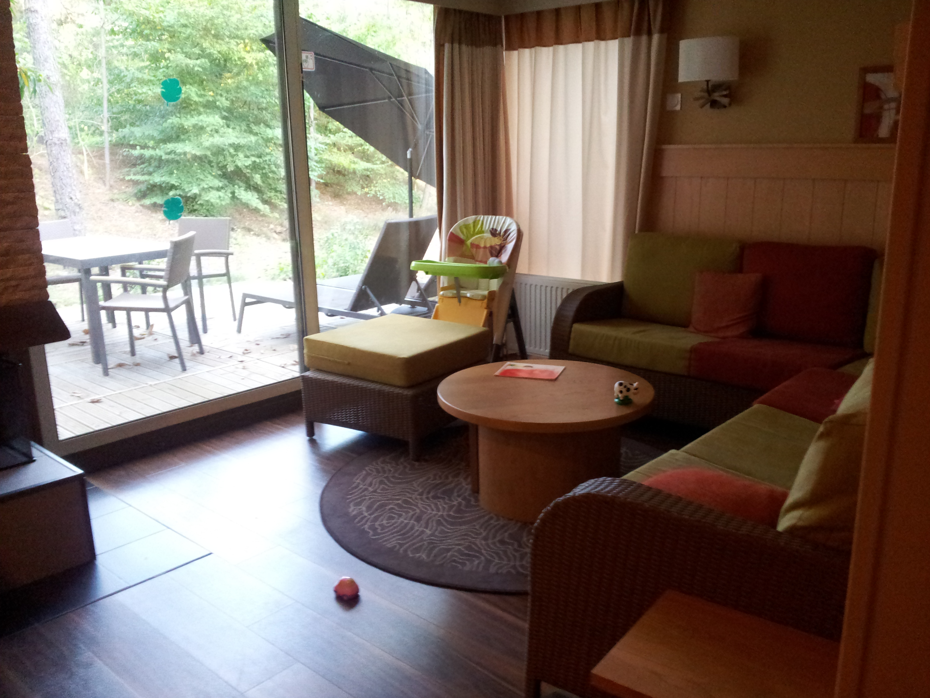 Une immense terrasse en bois borde tout le cottage et donne directement sur un bois très tranquille. On voit à peine les voisins… Un décor de rêve qui nous a vite fait oublier la déconvenue du début…