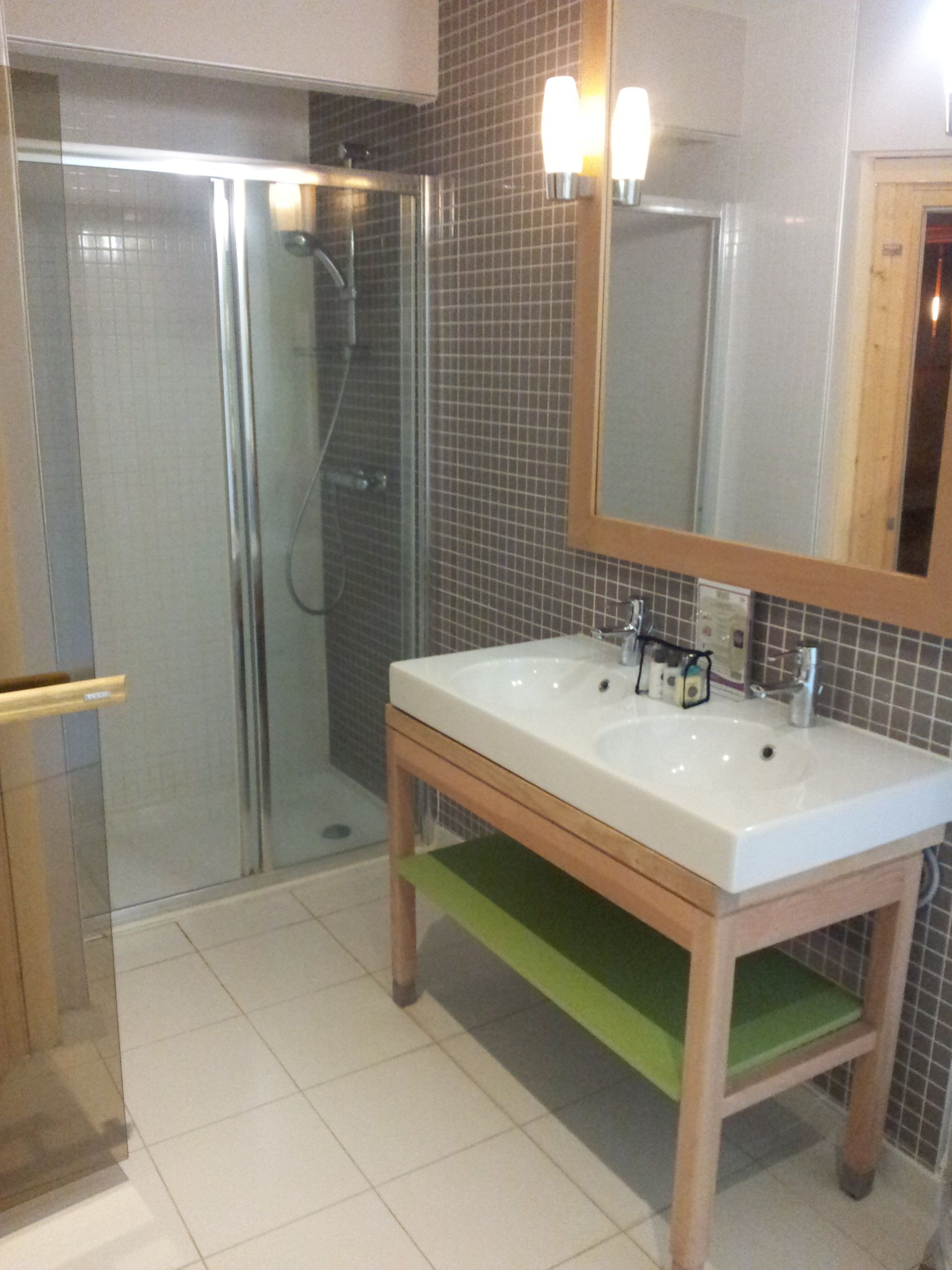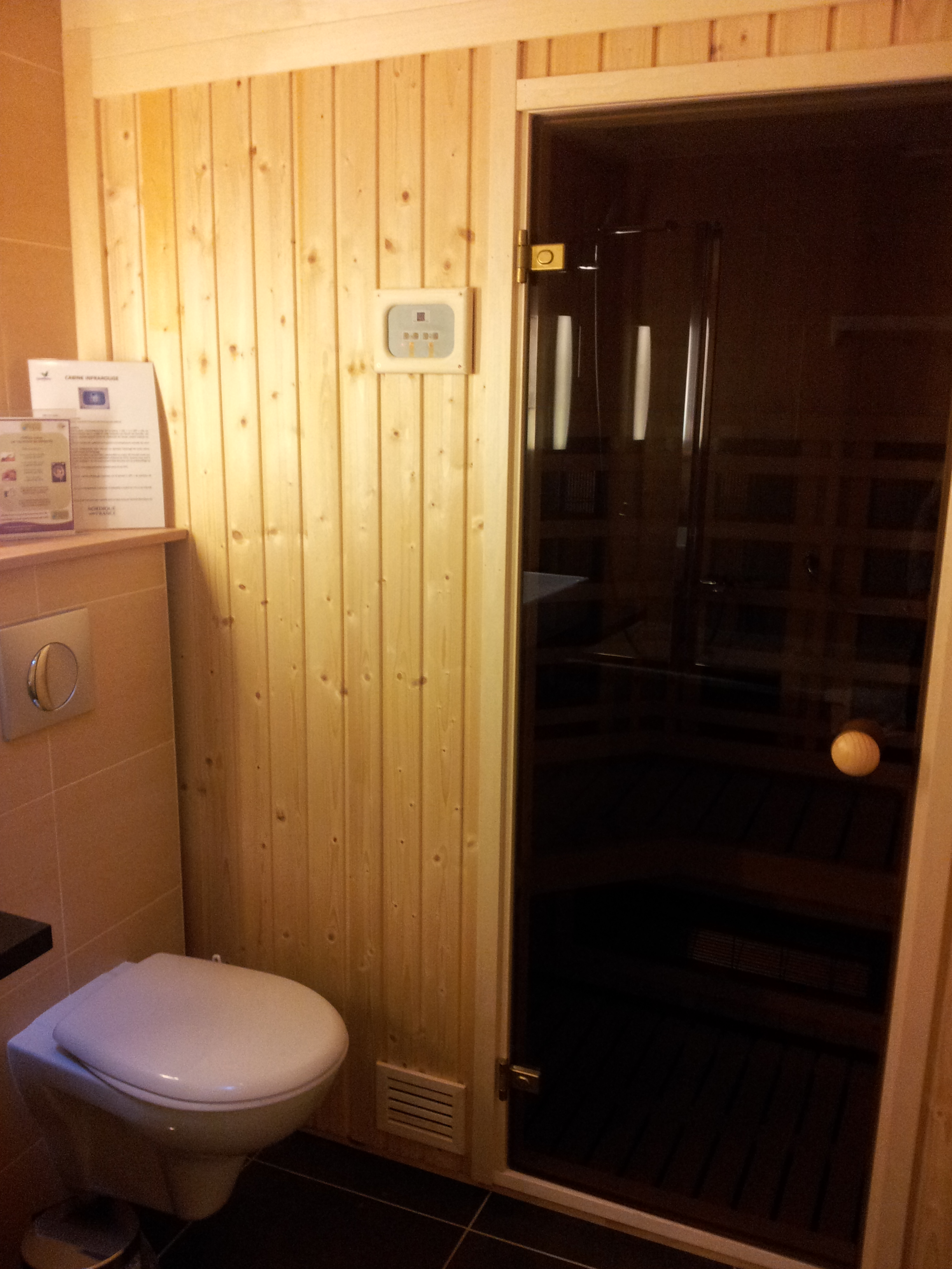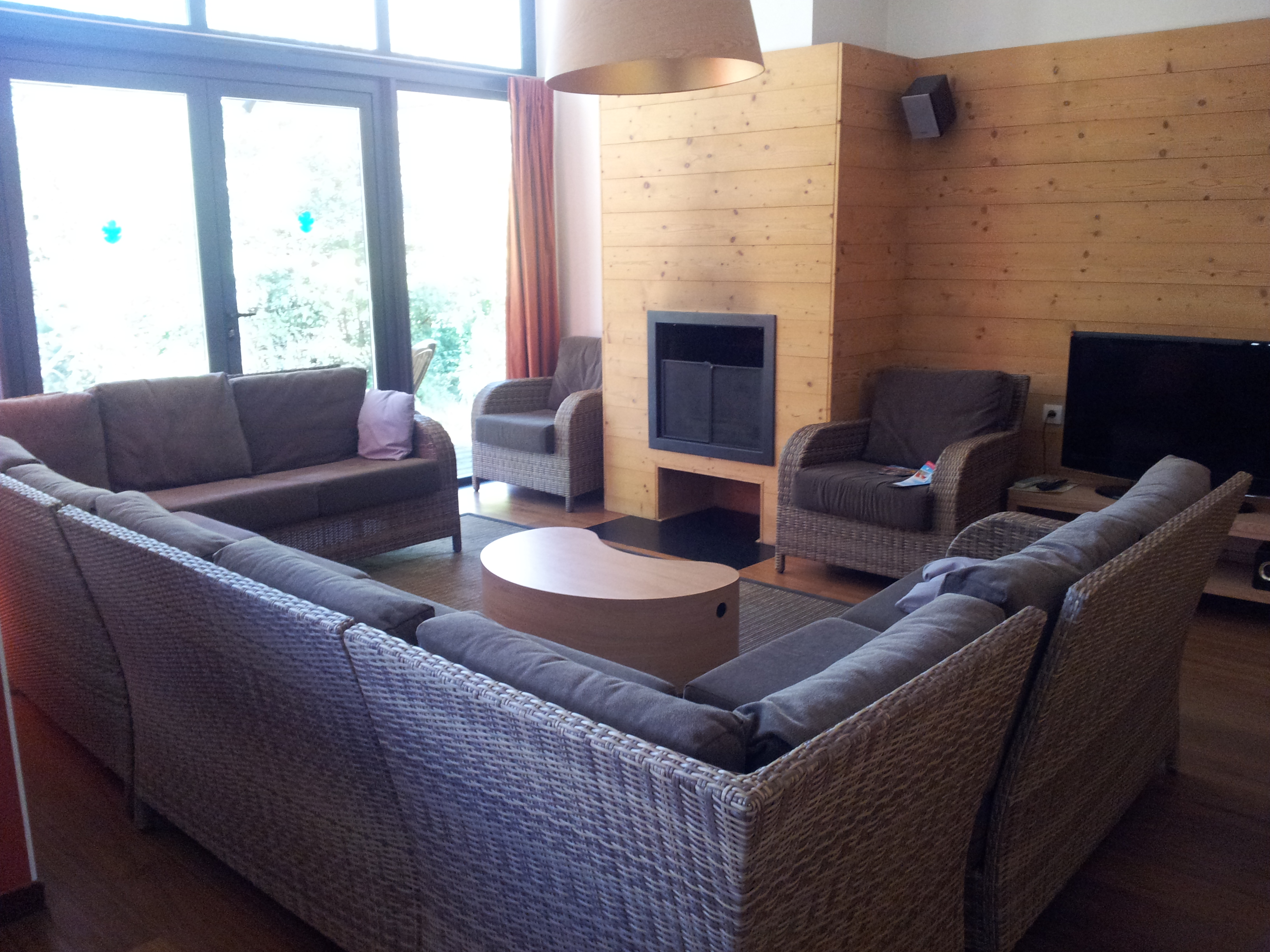 Je n’ai pas tout pris en photos, mais on a l’essentiel. Pour la visite guidée, en entrant dans le cottage, après un petit sas qui se ferme par porte coulissante, on arrive dans la salle à manger avec sa télévision, sa cheminée et le premier accès à l’immense terrasse. A gauche, un premier coin nuit (2 chambres, toilettes et salle de bains avec baignoire balnéo), et plus loin l’accès à une immense salle de bains de luxe : douche à l’italienne, double vasque, sauna et jacuzzi 2 places. A droite du séjour, une grande cuisine fait le lien avec l’autre partie du cottage (à l’origine, 2 cottage 6 personnes qui ont été réunis) : le salon et son immense canapé. Sur le chemin on trouve aussi 2 autres chambres a lit jumeaux, chacune possédant sa salle d’eau : lavabo et cabine de douche/hammam. Dans le salon, une autre cheminée, une autre télé avec dvd et home cinéma, ainsi que le deuxième accès terrasse. Et au fond, le deuxième coin nuit, le nôtre : salle de bains avec baignoire balnéo et toilettes, grande chambre parentale avec télévision et chambre avec lits jumeaux pour liloute.