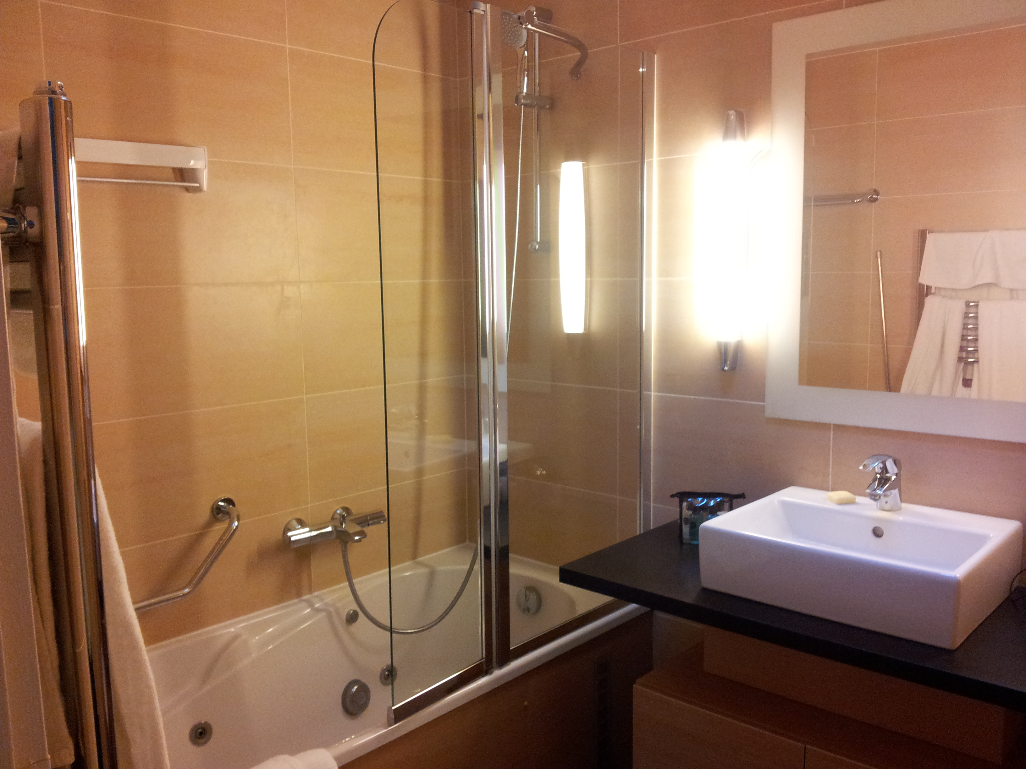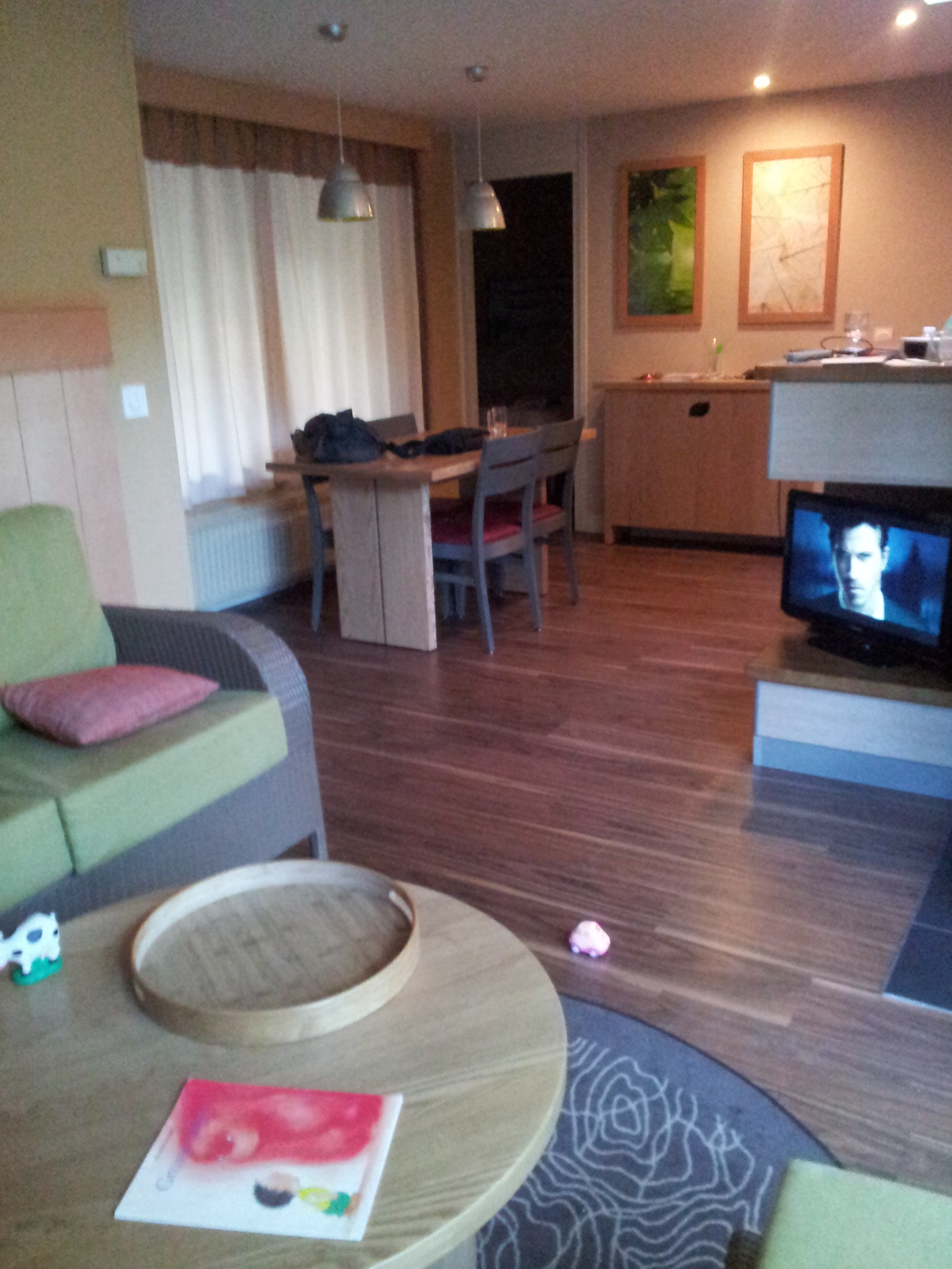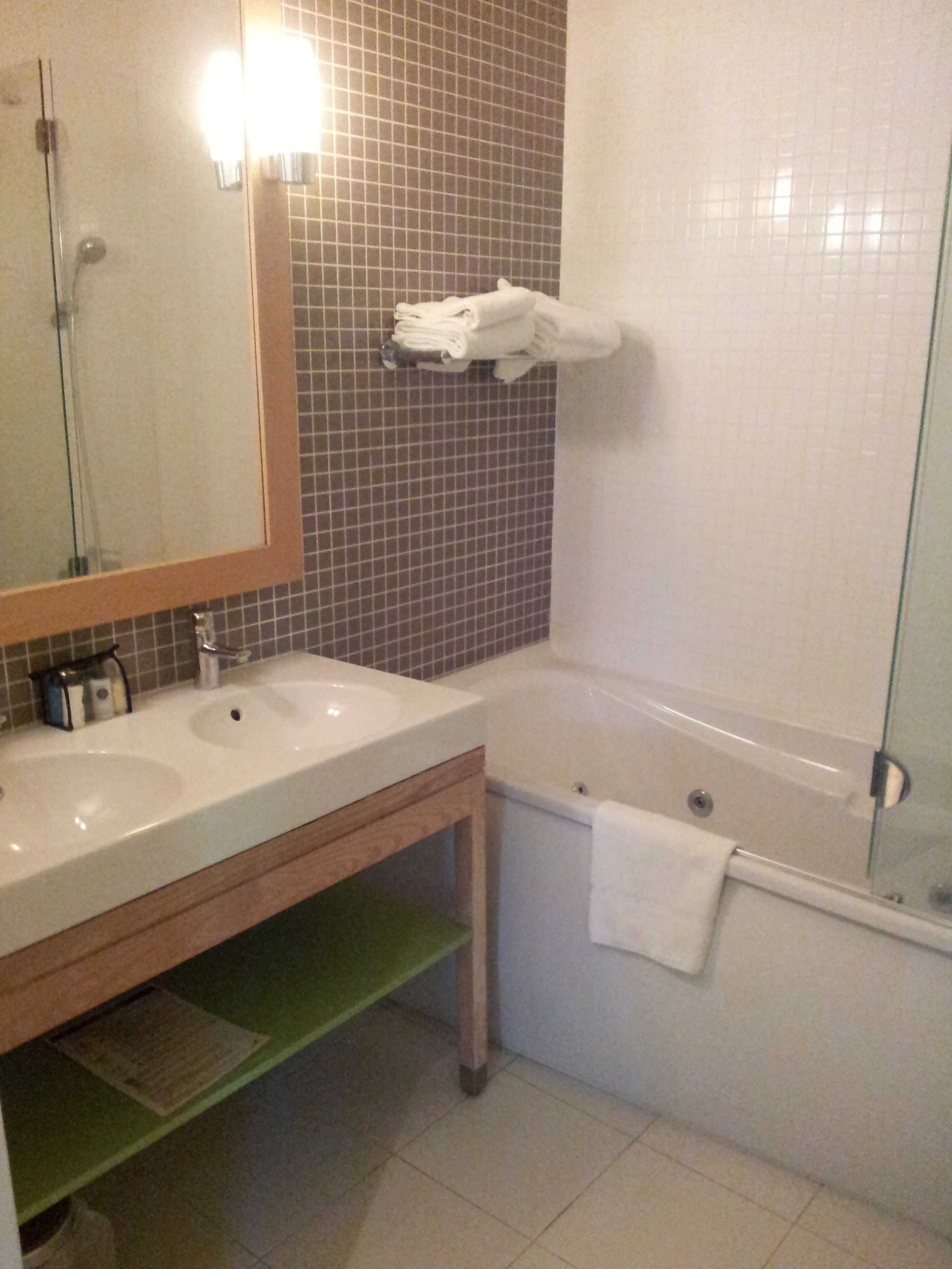 Je n’ai pas tout pris en photos, mais on a l’essentiel. Pour la visite guidée, en entrant dans le cottage, après un petit sas qui se ferme par porte coulissante, on arrive dans la salle à manger avec sa télévision, sa cheminée et le premier accès à l’immense terrasse. A gauche, un premier coin nuit (2 chambres, toilettes et salle de bains avec baignoire balnéo), et plus loin l’accès à une immense salle de bains de luxe : douche à l’italienne, double vasque, sauna et jacuzzi 2 places. A droite du séjour, une grande cuisine fait le lien avec l’autre partie du cottage (à l’origine, 2 cottage 6 personnes qui ont été réunis) : le salon et son immense canapé. Sur le chemin on trouve aussi 2 autres chambres a lit jumeaux, chacune possédant sa salle d’eau : lavabo et cabine de douche/hammam. Dans le salon, une autre cheminée, une autre télé avec dvd et home cinéma, ainsi que le deuxième accès terrasse. Et au fond, le deuxième coin nuit, le nôtre : salle de bains avec baignoire balnéo et toilettes, grande chambre parentale avec télévision et chambre avec lits jumeaux pour liloute.