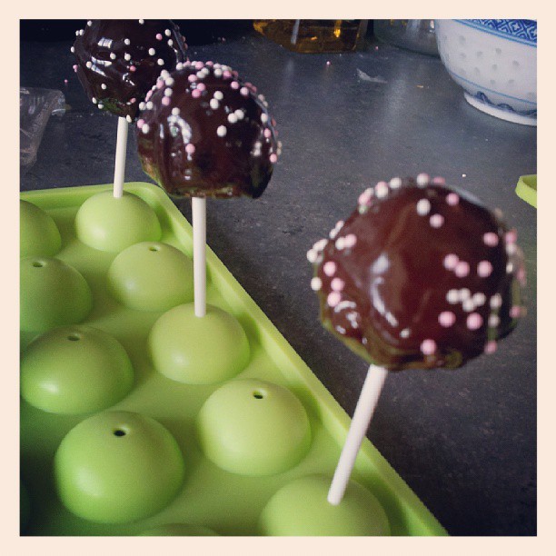 - Premier essai de cake pops: bof ! Entretemps, j’ai craqué sur une machine à cake pops chez casa, à moins de 15 euros… Et j’utiliserai du Candy Melt pour mieux les couvrir.