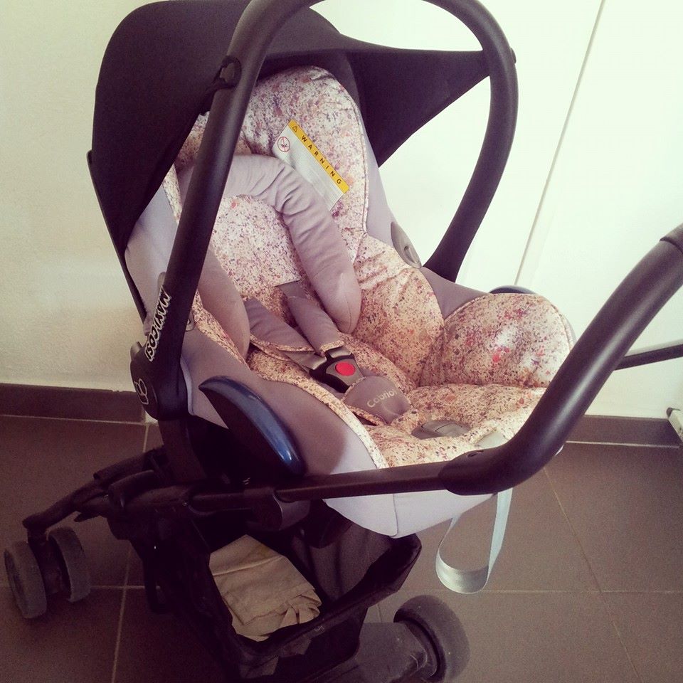 - Et le cosy de Miniloute sur ma poussette… Première fois que j’enlevais l’habillage complètement d’ailleurs, très facile ! Très simple aussi de mettre les adaptateurs et la coque, en quelques instants seulement ! Et voilà la Nuna Pepp transformée en poussette premier âge, je dois dire que j’adore… L’ensemble est super leger (c’est un des cosys les plus légers du marché, 3,5 kg!) la coque est grande et toute douillette, conçue pour durer ! La maniabilité de la Nuna Pepp est un plus non négligeable… On a rangé le tout, à dans quelques mois !