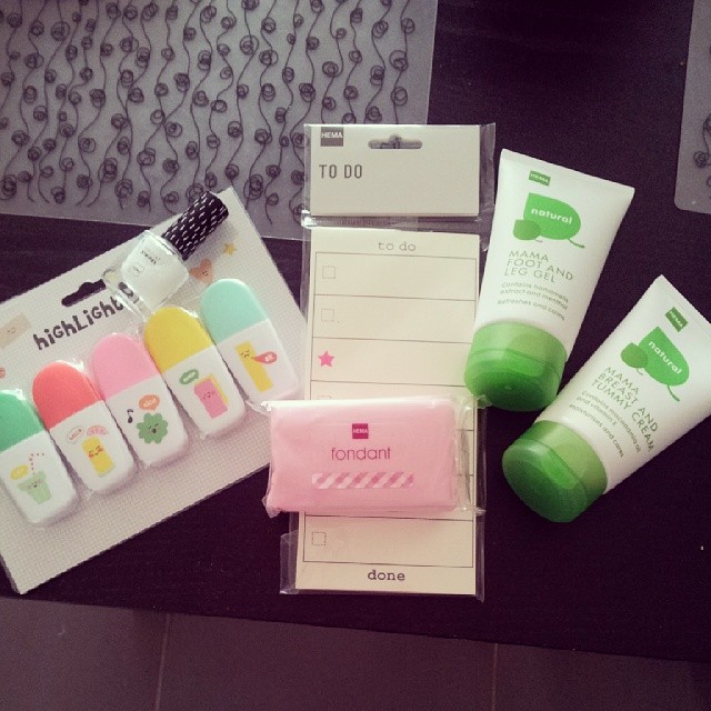 - Butin de shopping chez Hema : de la pâte à sucre, des surligneurs, un bloc note « to do », un top coat a batonnets blancs, une creme pour le ventre « future maman » et un gel jambes lourdes de la même gamme. A tout petit prix !