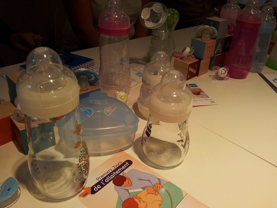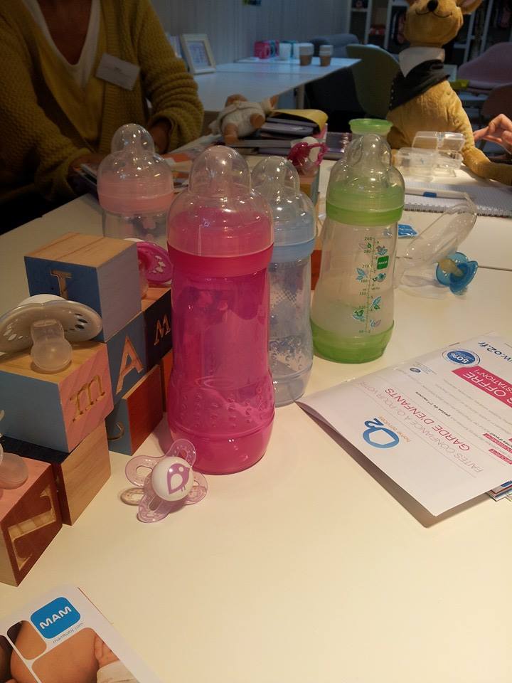 Pour cet atelier, on a parlé allaitement et biberon, le tout dans la joie et la bonne humeur ! Des tas d’infos sur l’allaitement, pour dédramatiser, partager et échanger sur ce sujet dont on ne parle parfois pas entre mamans. La consultante en lactation présente nous a expliqué le déroulement classique des premiers jours, nous a beaucoup rassurées et nous a donné LE conseil de base : Il faut s’écouter et écouter son bébé, essayer de ne pas trop « rationnaliser » l’allaitement, bref lâcher prise… Et aussi que si on ne veut pas allaiter, ne pas se forcer, qu’il ne faut pas hésiter à demander de l’aide aux professionnels également.