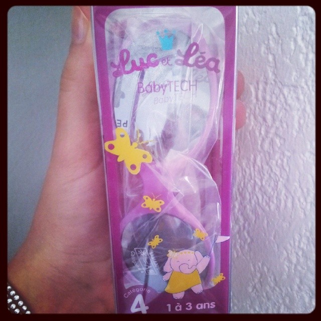 Je n’ai pas beaucoup eu de temps pour prendre des photos : dès qu’elle les a vues, Liloute s’est jetée dessus et a voulu les mettre ! Nous avons reçu une paire spéciale bambins de 1 à 3 ans, dans une jolie couleur violette, avec pochon de rangement et cordon élastique réglable et amovible pour les attacher à la tête de bébé.