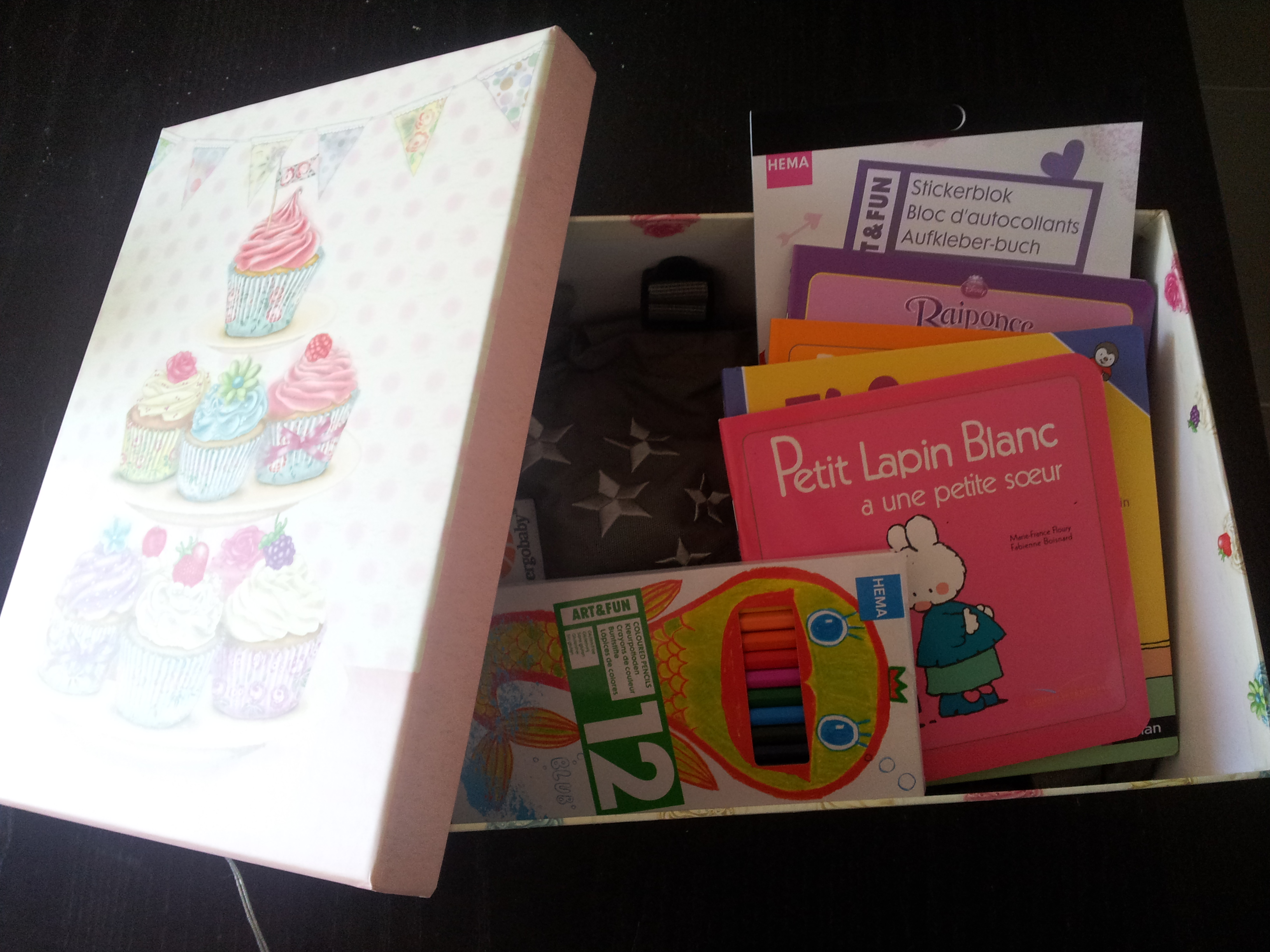 Au cours de mes lectures par ci par là sur la blogo, j’ai vu plusieurs fois revenir le concept de « boite à grande soeur / grand frère ». Je connaissais la « boîte à papa » qu’on prépare pour le père en vue du séjour à la maternité : petits cadeaux, lettre d’amour, bonbons, mots croisés etc… Et la variante adaptée aux aînés m’a tout de suite plu. Alors, au fil des dernières semaines, j’ai rassemblé des petits objets, des idées de cadeaux, tout mis dans une jolie boîte qui n’attend que mon départ à la clinique pour être ouverte par les petites mains de Liloute.
