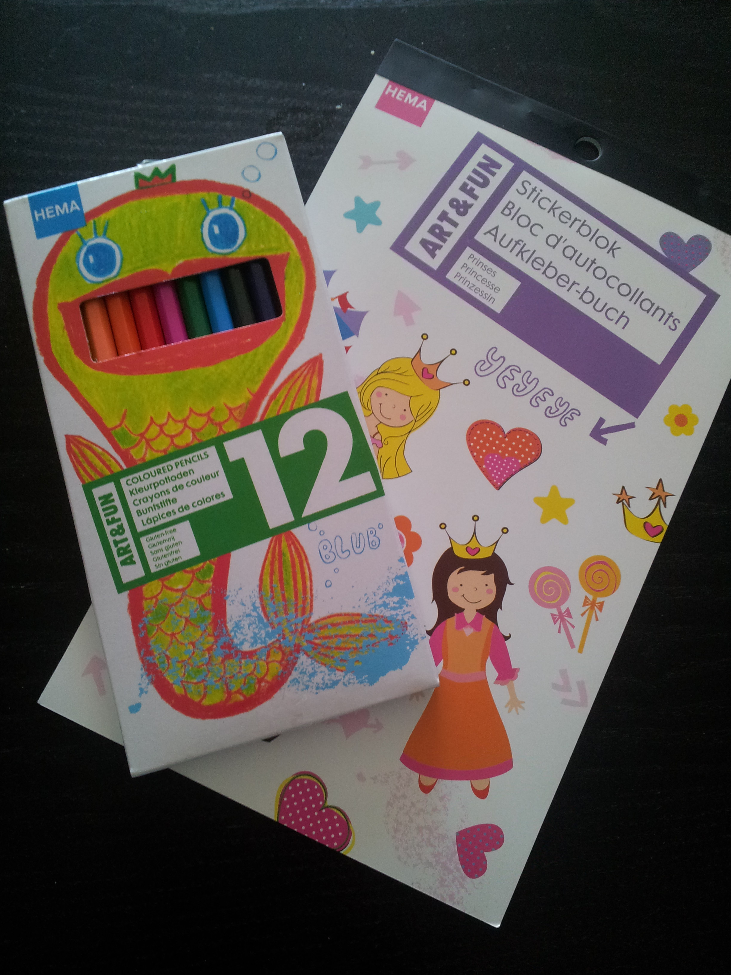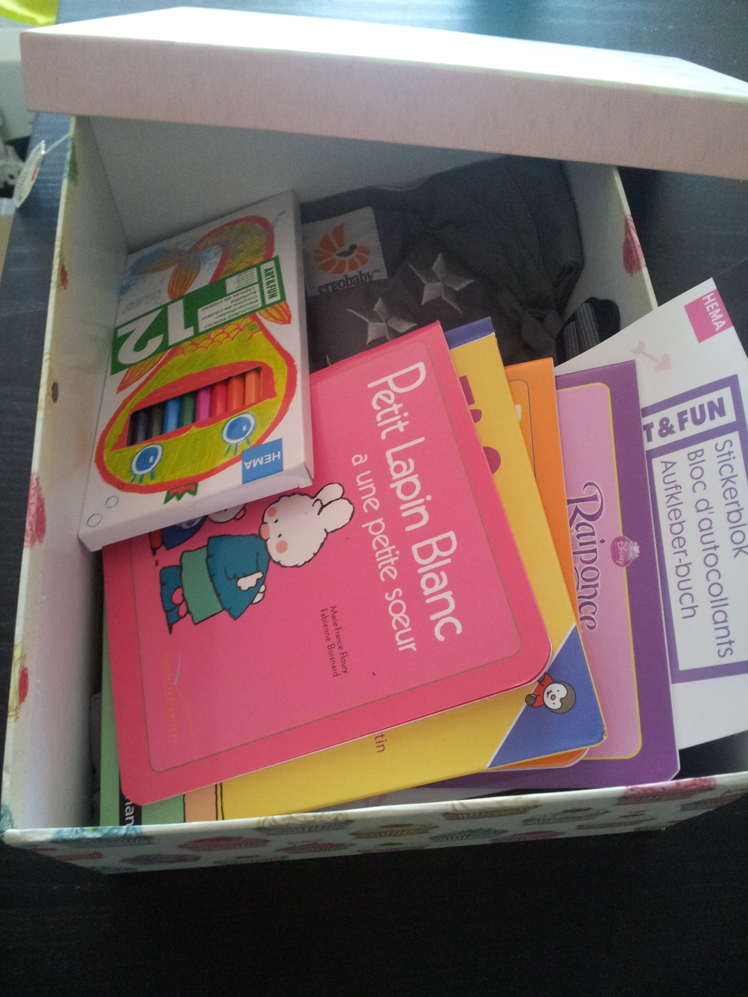 - Un bloc d’autocollants et des crayons de couleur de chez Hema : tout petit prix pour des dessins dont j’espère avoir un exemplaire lors des visites 🙂 J’ai aussi ajouté des feuilles de couleur dans la boîte, qu’on ne voit pas sur les photos.