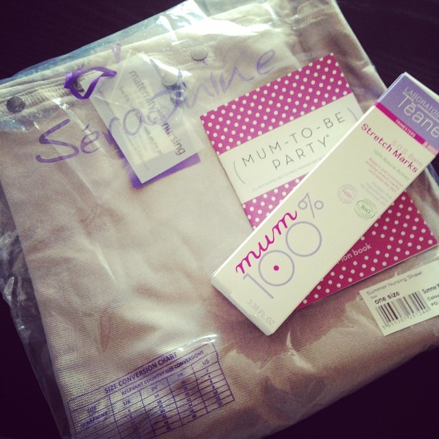 - J’ai reçu mon joli colis Mum-to-be-Party, avec un baume SOS vergetures Teane (faut qu’on en parle!) et mon châle d’allaitement Séraphine.