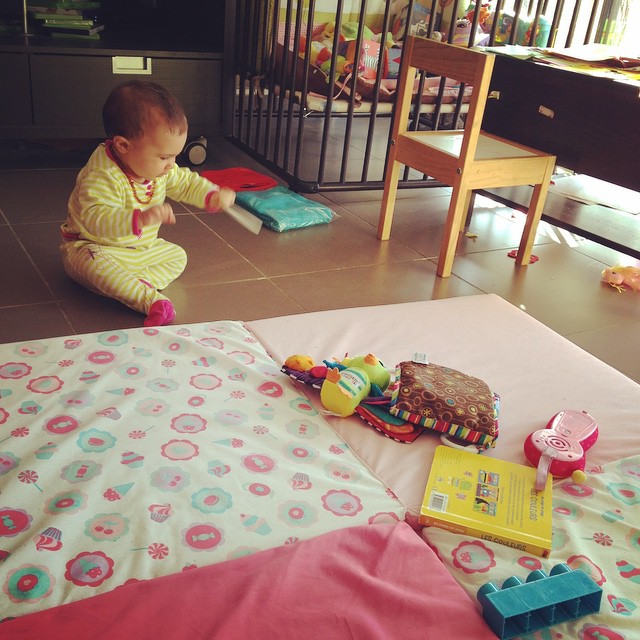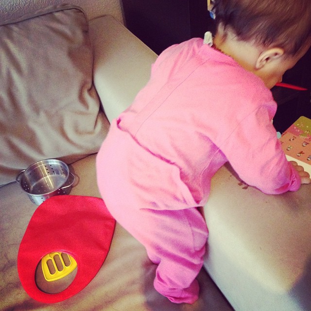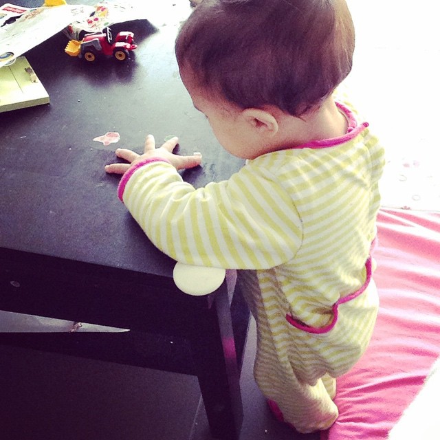 Ce mois ci, et particulièrement ces 2 dernières semaines, ma Miniloute a énormément évolué en ce qui concerne la motricité. Elle s’est mise à faire du 4 pattes du jour au lendemain (ou presque) puis a se lever dans son lit ou son parc en s’aidant des barreaux. Elle passe sans soucis de la position assise aux 4 pattes et inversement, veut être debout en permanence. Du coup, le tapis qu’on a acheté il y a à peine 2 semaines pour lui permettre de jouer au sol ne sert que quelques minutes, après cela bébé a envie de découvrir le monde (enfin, plutôt le séjour), fait du 4 pattes sur le carrelage, s’assied, repart, se hisse debout grâce à la table basse (et mon coeur de maman bondit, ma main prête à saisir l’arnica et le bébé)… Il lui arrive même ces derniers jours de mettre un pied devant l’autre ou de se déplacer en se tenant aux meubles… Il faudrait qu’on remonte la poussette de marche qu’avait eu Liloute pour son premier anniversaire, ainsi que la table d’activités. Et je pense qu’on dira bye bye au parc, car de toute façon elle pleure systématiquement quand je l’y pose. Elle veut de la liberté !