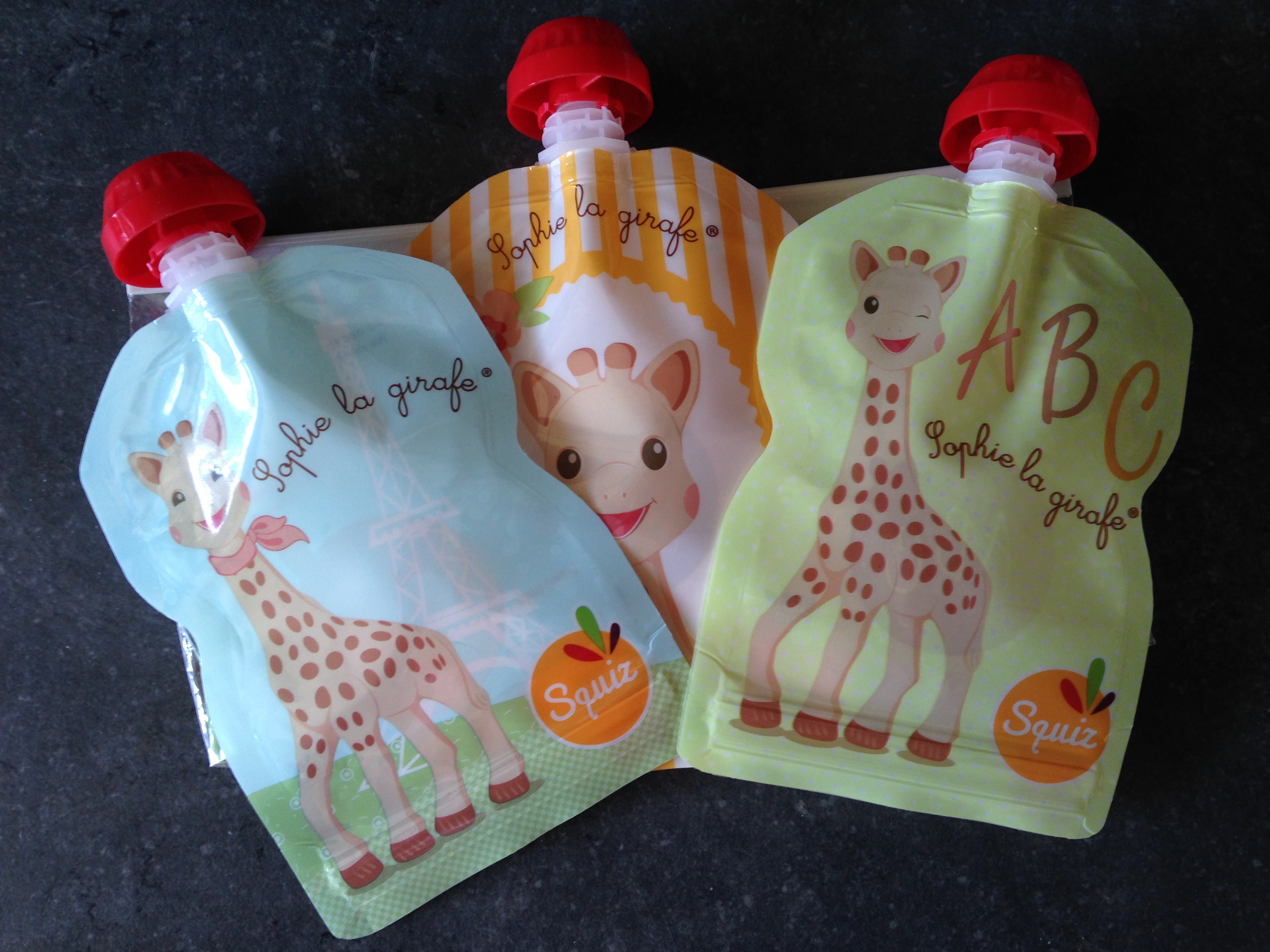 Gourdes réutilisables Squiz Sophie la Girafe, par lot de 3, 15€90. Produit offert par la marque (merci !)