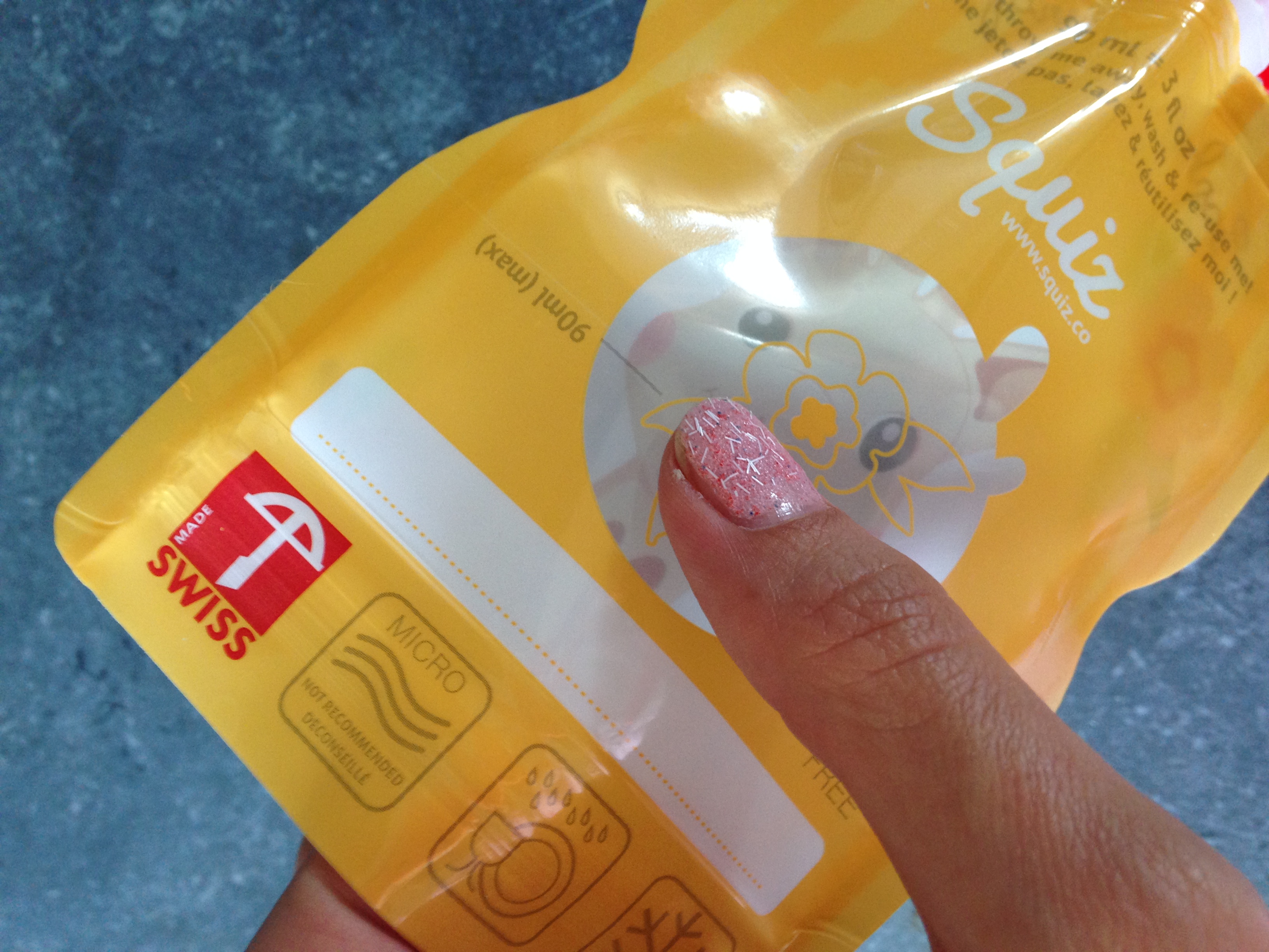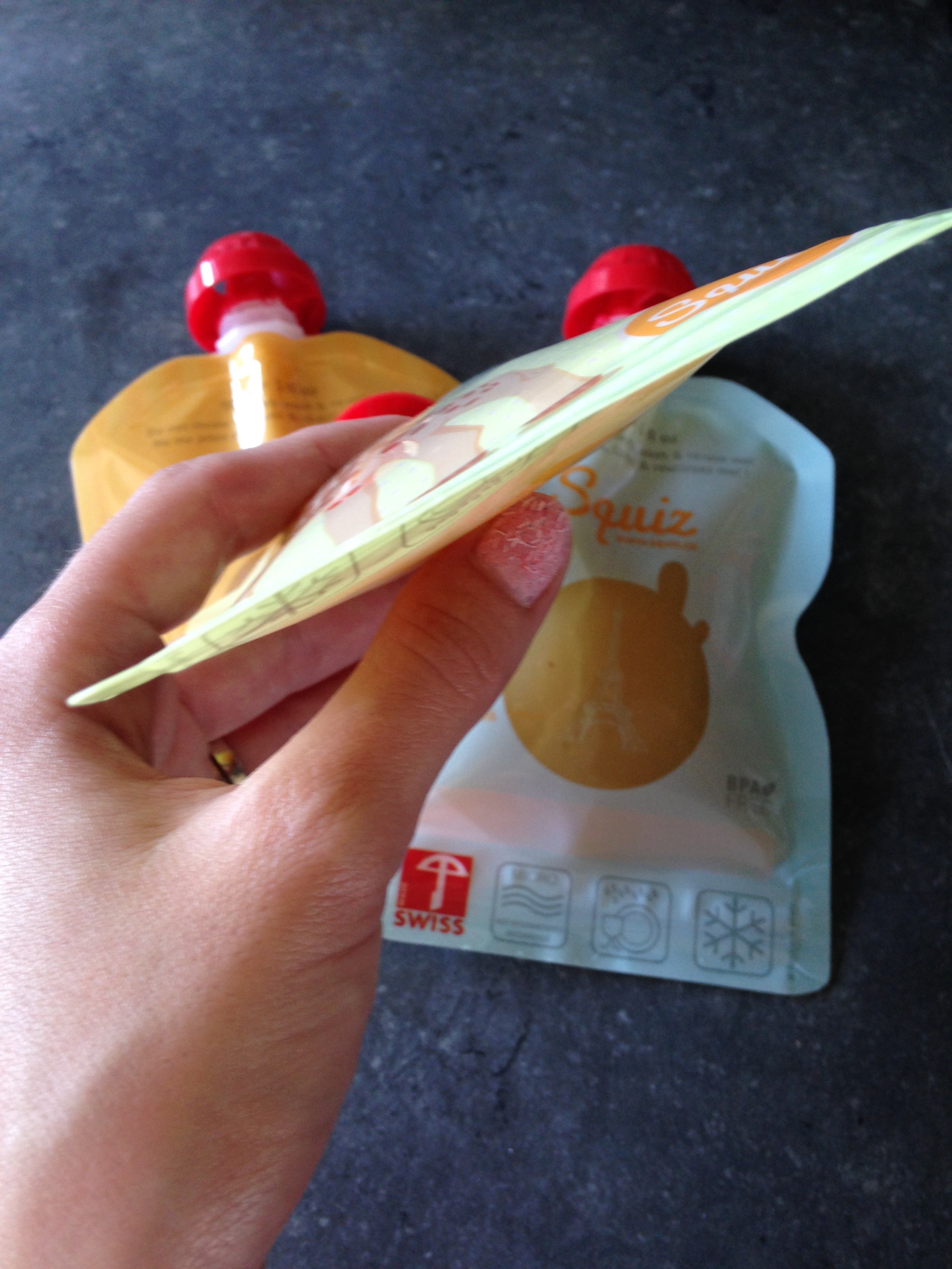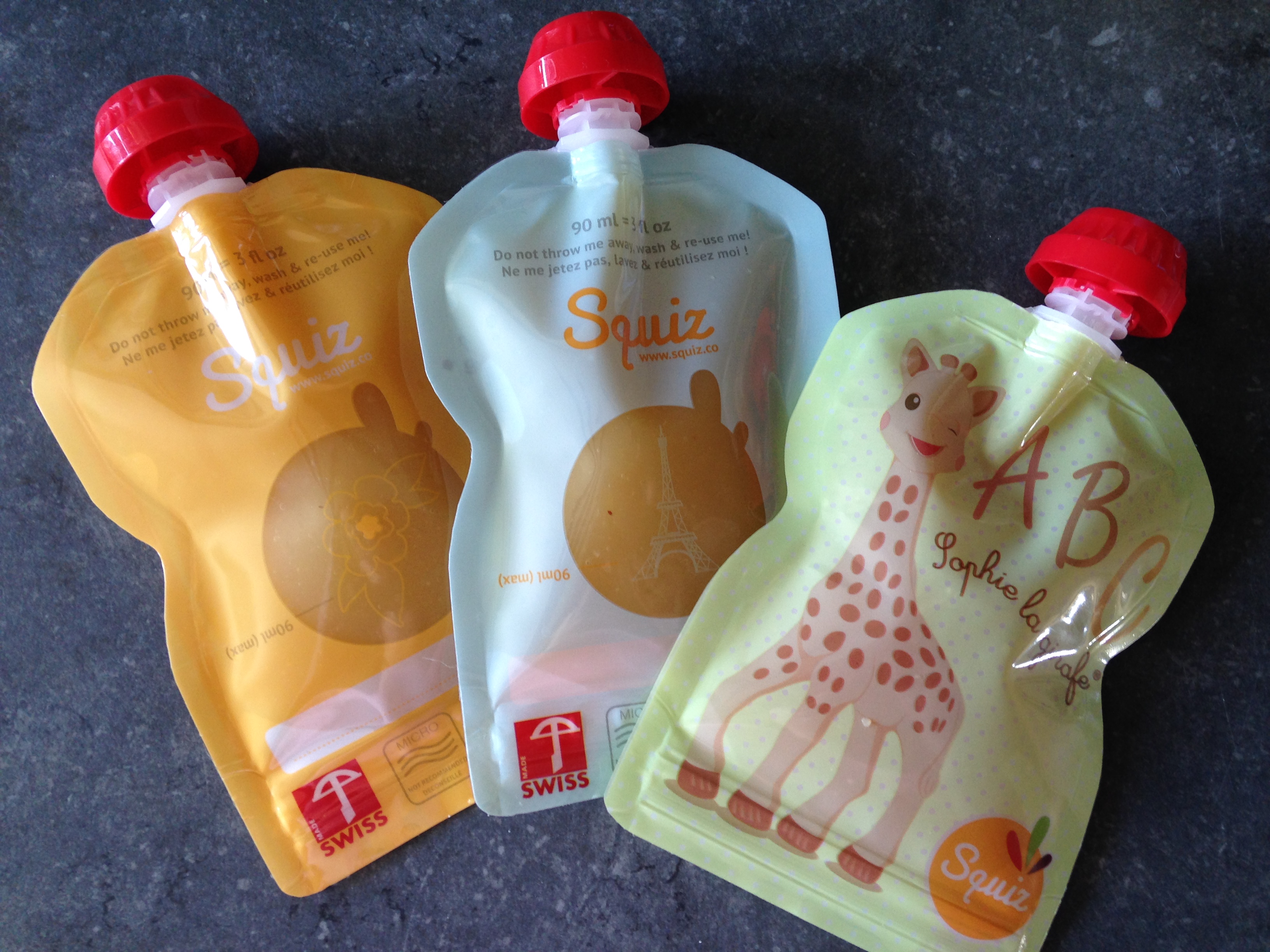 Une petite présentation pour commencer : Squiz est une marque suisse fondée par une sage femme maman de 5 enfants. Les gourdes sont fabriquées en Suisse à partir de matériaux Européens, sans BPA, Phtalates ni PVC. Vendue par lot de 3 dans une pochette recyclable et réutilisable, la gourde Squiz est conçue pour durer : 50 utilisations en moyenne. Elle est étanche et sa large fermeture est très solide : aucun risque de fuite pendant les balades avec bébé.