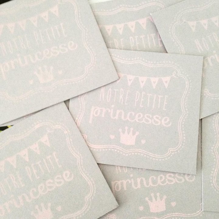 - J’ai utilisé mon tampon (j’avoue qu’à la base je l’ai pris car en promo et que j’ai craqué dessus !) avec mon encreur rose pâle qui date du faire part de Liloute, il y a 4 ans ! Et il fonctionne encore bien, la preuve, j’ai pu faire de mini étiquettes grises toutes mignonnes. Il n’y a là que le verso, le recto sera blanc et liberty et vous pourrez l’apercevoir plus bas 😉 Si j’ai le courage, ces petites étiquettes seront destinées aux contenants boule en plexi qui renfermeront dragées et papier de soie pour les invités. Sinon, elles feront office de déco !