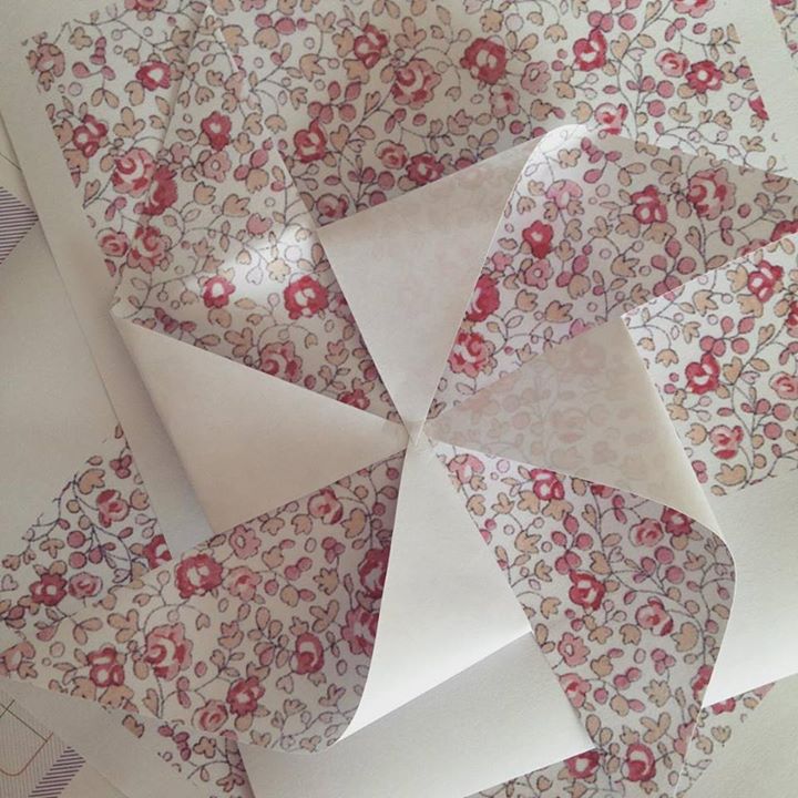 - Ne trouvant pas de papier scrap Liberty Eloise Rose, on l’a imprimé en plusieurs formats. J’ai utilisé le fichier que je gardais depuis la confection du faire part de Miniloute. Les étiquettes vierges seront collées par du masking tape sur des gobelets (argent ? blanc ? je ne sais pas encore) pour pouvoir marquer les noms de chacun au stylo pailleté argent (récup, encore une fois !) Les grands carrés ont servi à faire des moulins à vent.
