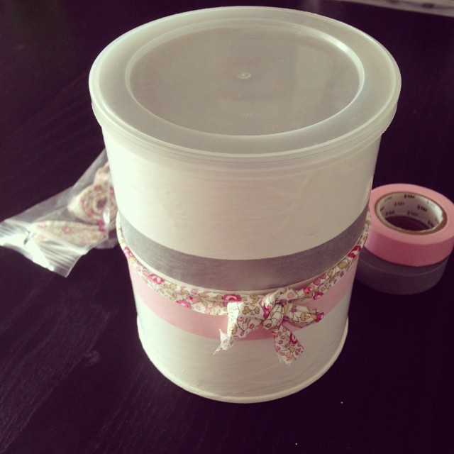 - Juste après avoir peint le chiffre 1, j’ai utilisé le reste de peinture blanche (qui date d’ailleurs de la maison playmobil en bois… récup encore !) pour peindre une boite de blédine et je l’ai ensuite décorée au masking tape et avec un ruban liberty. Cette boite va surtout servir à ranger les étiquettes pour l’instant mais sera ensuite destinée aux pailles, couverts etc sur la table !