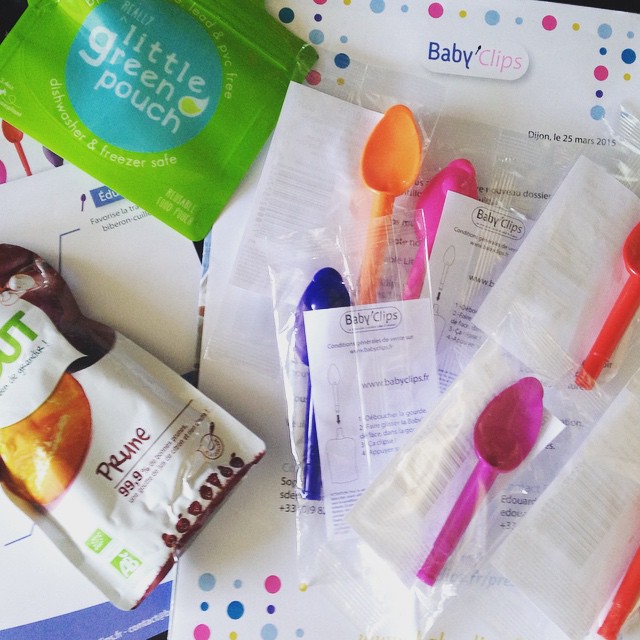 J’ai donc pu découvrir les nouvelles cuillères clipsables et stérilisables Baby’Clips, désormais déclinées en plusieurs couleurs, une gourde Good Gout à la Prune, partenaire de la marque, ainsi qu’une mini gourde réutilisable format spécial avion Little Green Pouch. Nous avons commencé par le test des cuillères avec la gourde Good Goût et j’avoue avoir apprécié la facilité d’utilisation : un clip et hop c’est fixé solidement (avec une sécurité enfant), la cuillère n’est pas trop grosse, le débit est parfait et facile à gérer, les bords de la cuillère sont doux et non coupants… Bref 10/10 pour l’aspect pratique !