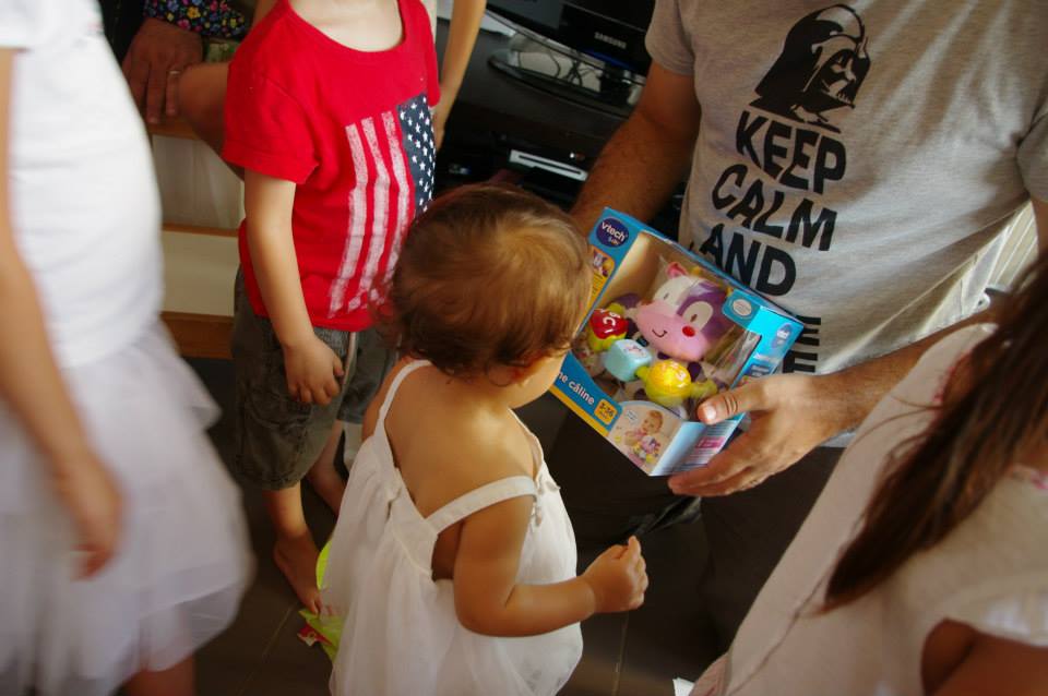 Je garde un très bon souvenir de cette fête d’anniversaire avec la famille et amis proches, ma Miniloute a été un peu effrayée par tout ce monde au lever de sa sieste mais a vite pris ses marques (et pas trop pleuré malgré la vilaine poussée dentaire !) Elle a grignoté des cake pops et un peu de gâteau (sans le glaçage qui contenait des PLV), a été impressionnée par la chanson d’anniversaire et a vite compris le principe des cadeaux 😉