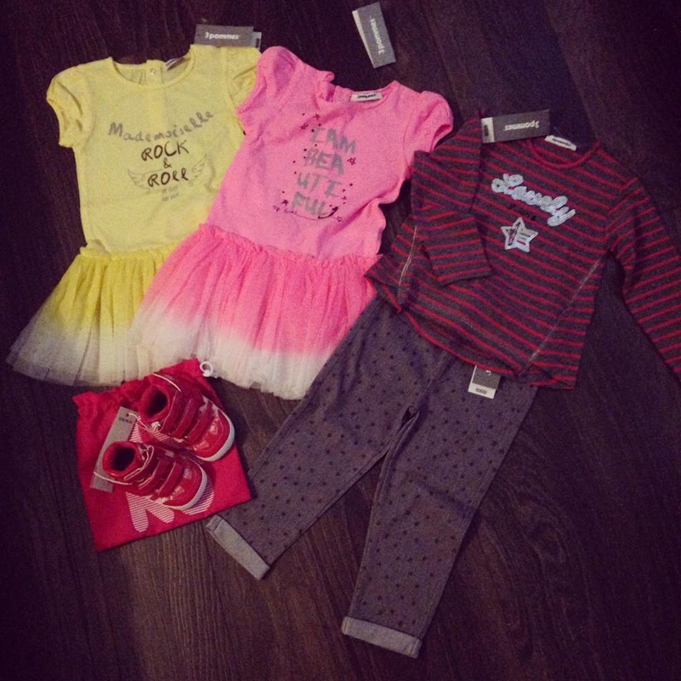 Dans mon colis, deux jolies robes 3 Pommes de fin de collection printemps/été, un tregging à étoiles et un t shirt rayé 3 Pommes également ainsi qu’une paire de baskets bébé Ikks dans leur petit sac assorti. Vous aurez l’occasion de le constater par vous même mais j’ai eu un gros coup de coeur pour la marque 3 Pommes que je ne connaissais pas, tout comme ma copine Maman Chou (vous pouvez d’ailleurs lire son article et ses impressions sur Kidiliz sur son blog)