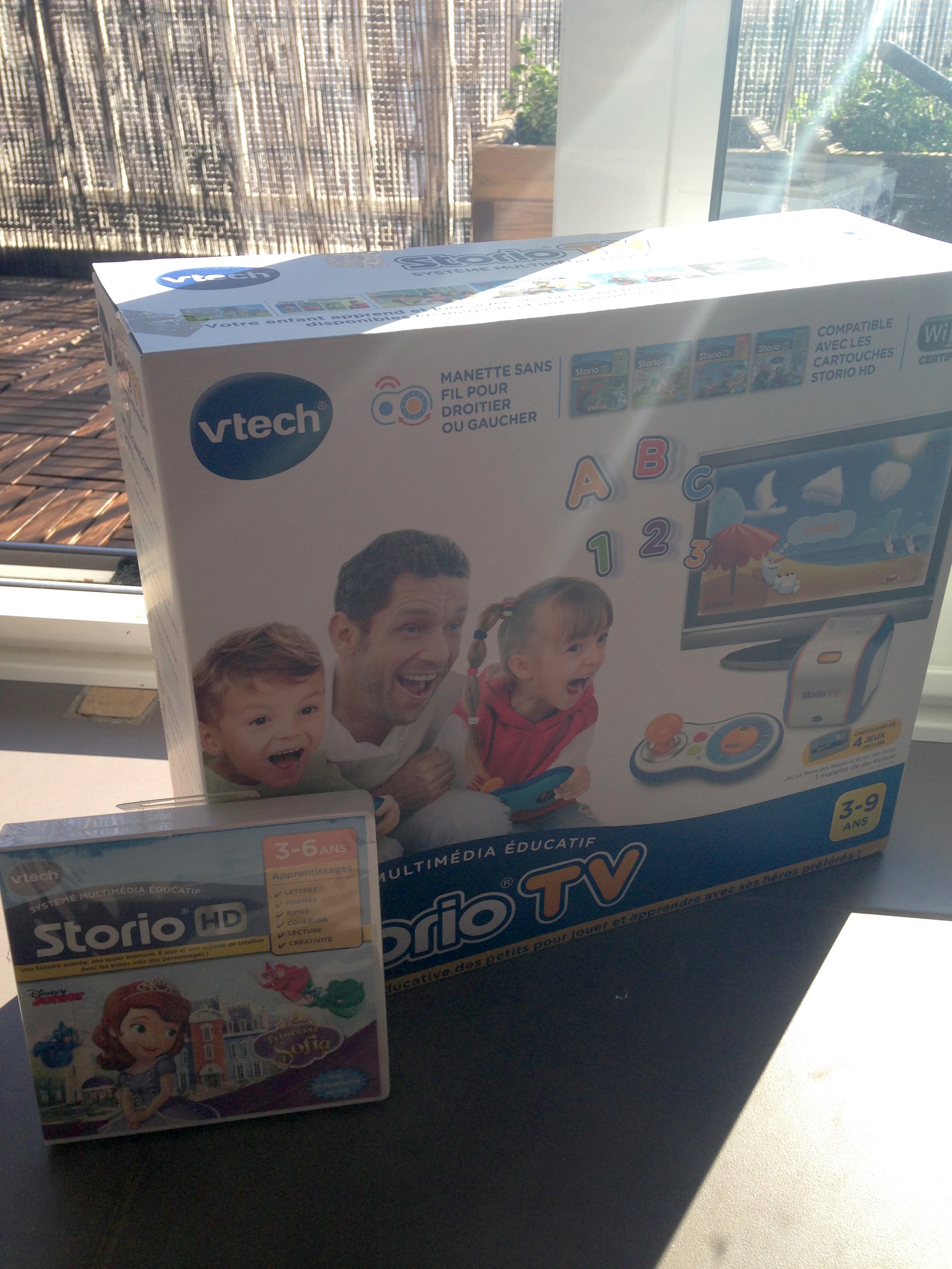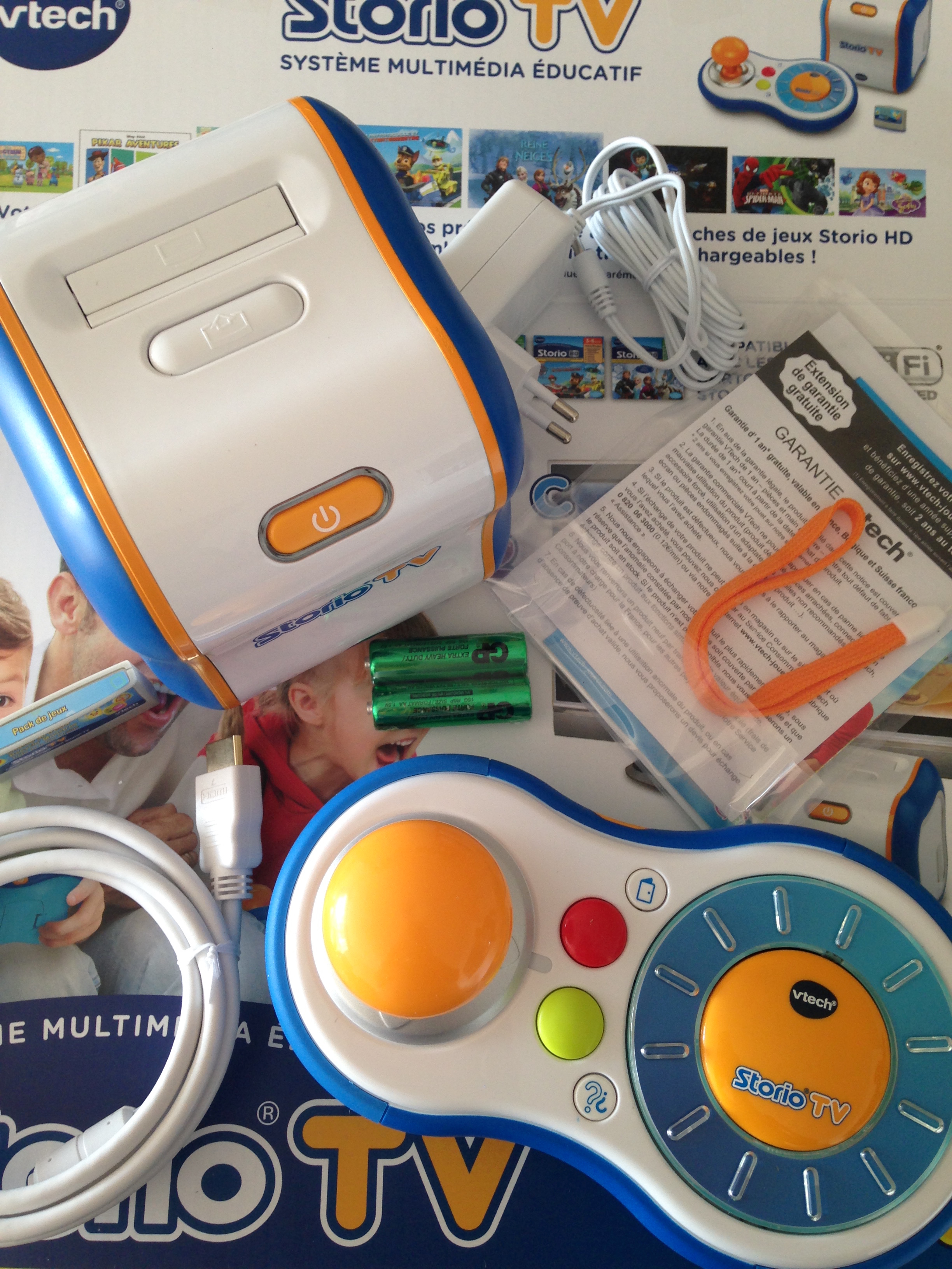 Nous avons donc eu la chance de recevoir une nouveauté de chez Vtech, la console pour enfants Storio TV. Bon, je vois certains d’entre vous froncer les sourcils et je vous avoue que je comprends : une console à partir de 3 ans, ça peut faire grincer des dents. J’avais un tout petit a priori, car chez nous les écrans sont présents mais contrôlés, et que sa tablette, ma Liloute n’y touche presque jamais, même si je la trouvais peut être un peu jeune pour une utilisation « trop » intensive. Et puis j’avoue que j’aime bien Vtech et que je me doutais que la console devait plutôt avoir une portée éducative quand on l’utilise avec parcimonie.