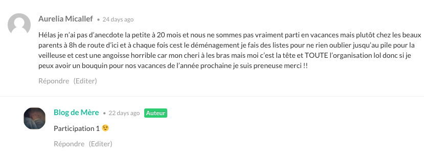 Hélas je n’ai pas d’anecdote la petite à 20 mois et nous ne sommes pas vraiment parti en vacances mais plutôt chez les beaux parents à 8h de route d’ici et à chaque fois cest le déménagement je fais des listes pour ne rien oublier jusqu’au pile pour la veilleuse et cest une angoisse horrible car mon cheri à les bras mais moi c’est la tête et TOUTE l’organisation lol donc si je peux avoir un bouquin pour nos vacances de l’année prochaine je suis preneuse merci !!