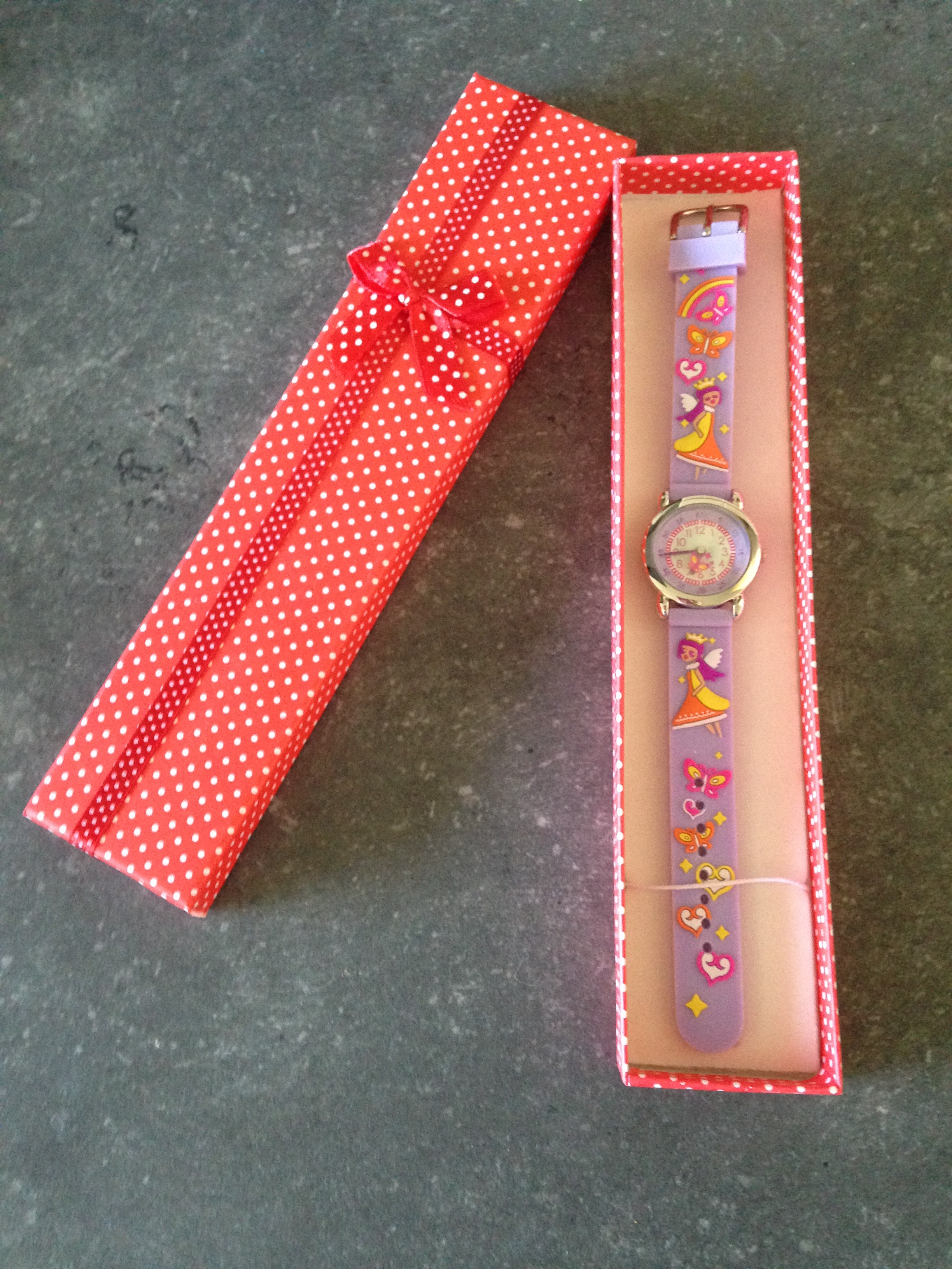 Quelques jours plus tard, nous avons reçu la montre dans une très jolie boite cadeau que j’ai offert à Liloute pour voir sa réaction. Sans surprise, elle a beaucoup aimé !