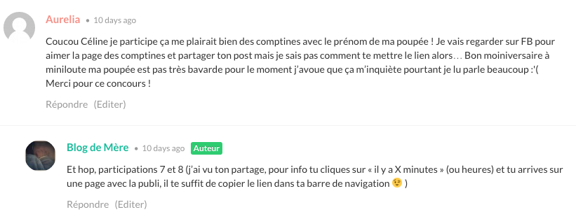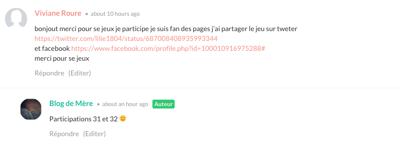 Et hop, participations 7 et 8 (j’ai vu ton partage, pour info tu cliques sur « il y a X minutes » (ou heures) et tu arrives sur une page avec la publi, il te suffit de copier le lien dans ta barre de navigation 😉 )