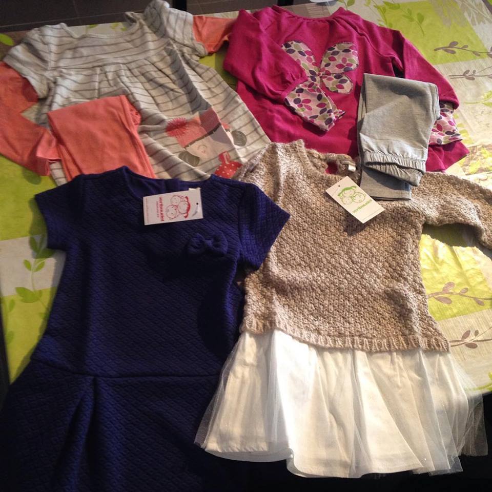 A droite pour Liloute : une robe pull et tulle en 4 ans, choisie en lisant les avis sur le produit qui taille effectivement grand, une robe molleton et deux ensembles « spécial maternelle » (comprenez qui peuvent se mettre dans les deux sens) en 5 ans.