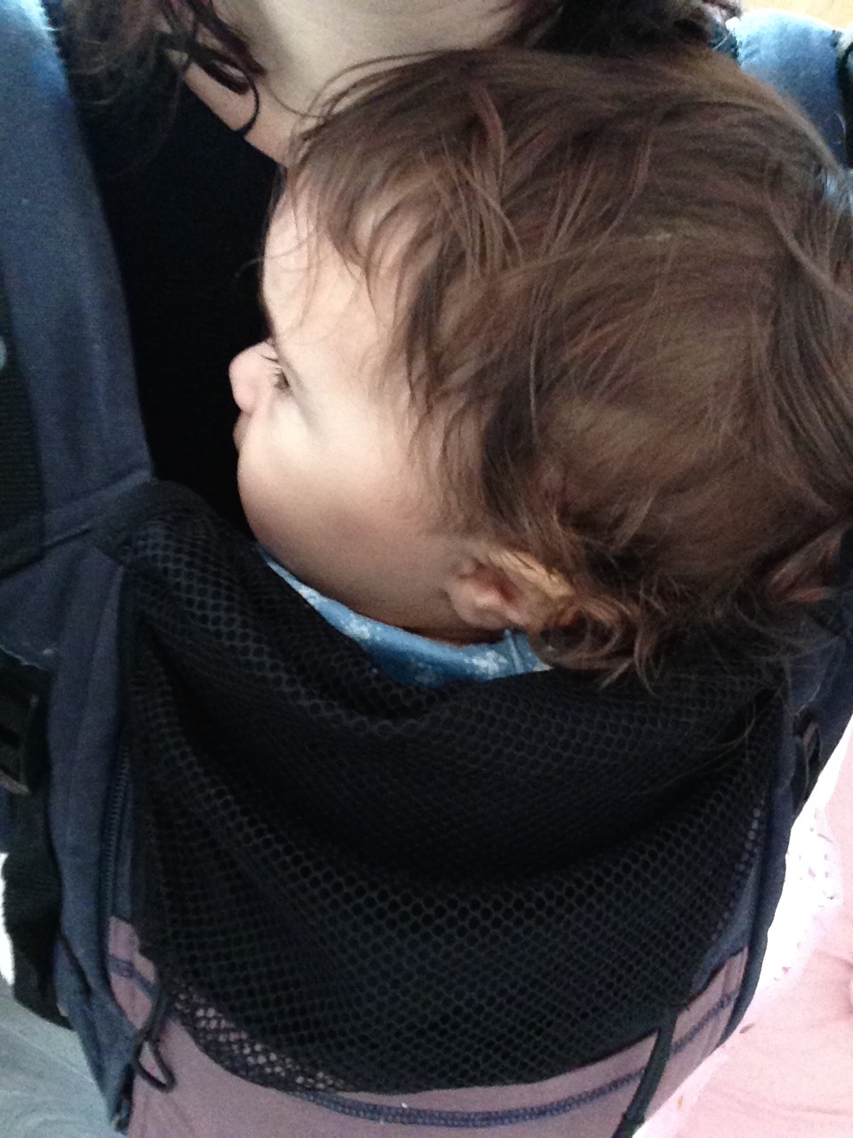 Par contre, je n’ai pas franchement l’utilité du miroir pour voir bébé en dorsal. Je prends mon téléphone ou je regarde dans un miroir au mur si j’ai besoin de voir. Par contre, ça occupe et ça amuse beaucoup Miniloute, alors… Je n’ai pas non plus testé la capuche en filet, et sur ce point je préfère celle de mon Boba3G, bien pratique quand il pleut. Mais du fait de ses matériaux, le physiocarrier est super léger, on ne peut pas tout avoir…