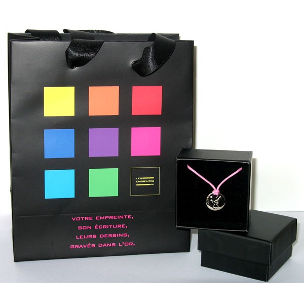 Un autre produit qui me plait beaucoup sur le site et qui est lui aussi une belle idée de cadeau pour la fête des mamans, c’est le pendentif galet (argent, or jaune ou blanc) avec l’empreinte de main de votre enfant, monté sur un joli cordon de couleur. On peut aussi faire imprimer un prénom ou un dessin d’enfant sur ce type de bijou. (Prix : à partir de 129 € cordon compris)