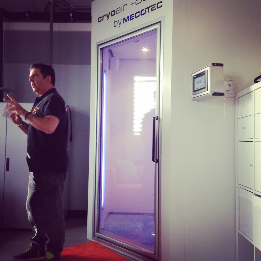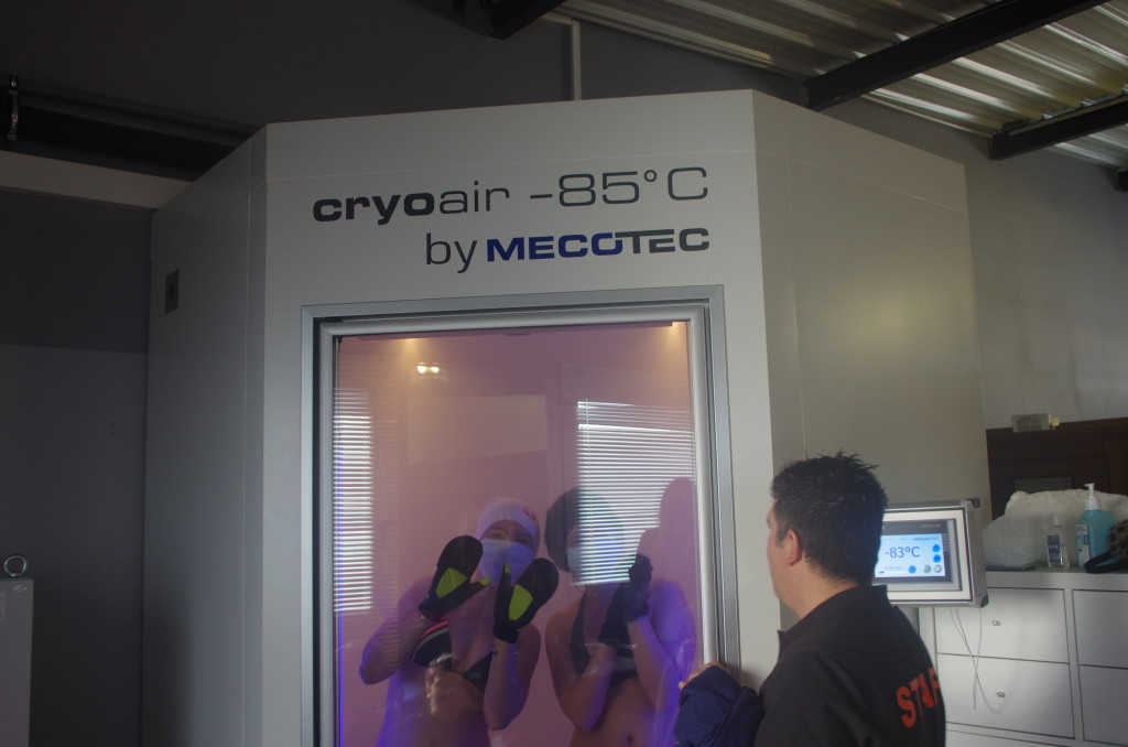 Nous avons commencé cette matinée sportive par une séance de cryothérapie. Mais qu’est ce que c’est ? C’est une séance de 3 minutes dans une cabine à -90 degrés en bikini… Oui, moi aussi j’ai frissonné quand on m’a dit ça ! Même que je ne voulais pas vraiment le faire… Et en plus j’y suis allée en premier, moi la claustro frileuse ! Plus sérieusement, les bénéfices de ce froid sec sur l’organisme sont nombreux : récupération musculaire, traitement des douleurs articulaires et de nombreuses pathologies… Equipée d’un bonnet, de grosses surchaussettes et de gants, on rentre dans la cabine et on y reste sous la surveillance d’un coach qui communiquera avec vous par signes tout le long (parce que non, on n’entend rien dans la cabine à part la musique qui y est diffusée !) On est passés par groupe de deux et j’avoue que c’est mieux pour une première fois, ça rassure ! Alors je ne vais pas vous mentir, j’ai eu froid, les sourcils gelés, à la fin j’avais vraiment envie de sortir mais… Comme promis ça fait vraiment du bien !