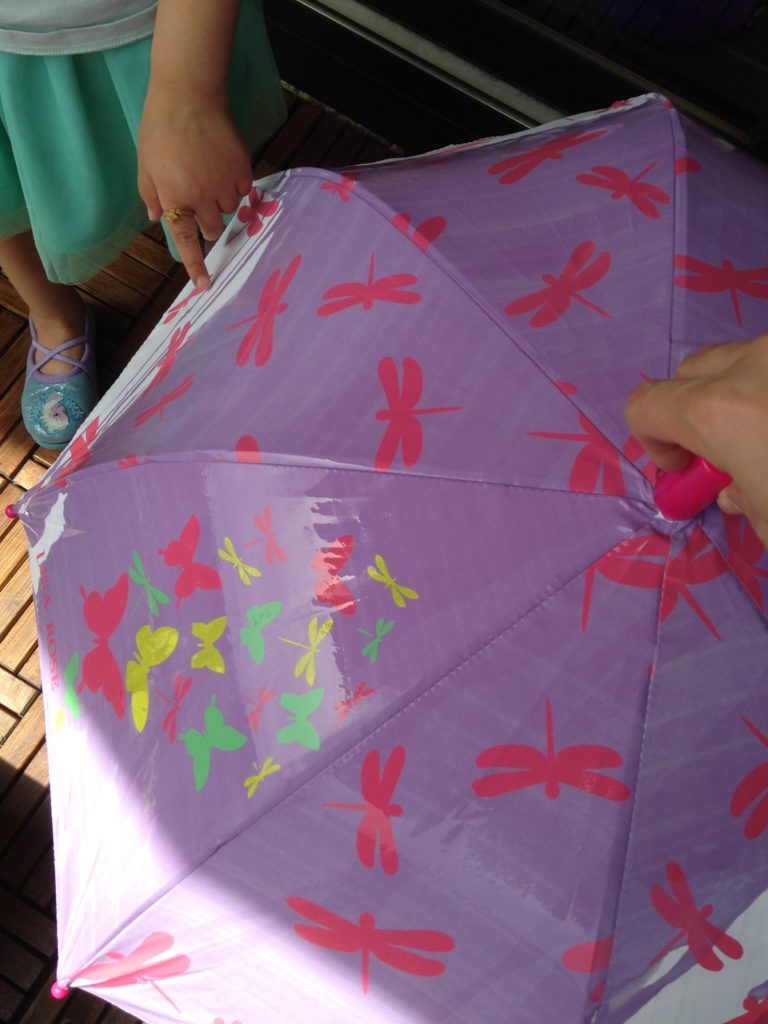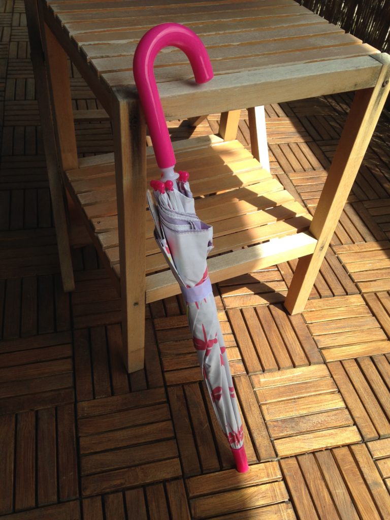 Nous avons fait quelques photos de notre parapluie pour le tester (et pour que Liloute puisse enfin voir comme il change de couleur, jouer avec pendant une bonne demi heure sur le balcon…), on ne fait pas attention à la déco de la terrasse ou à la tenue de Liloute, non, l’important c’est le parapluie magique !