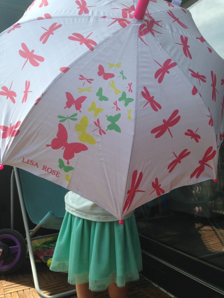 Et voilà que Z Generation nous envoie un super parapluie magique ! Inutile de vous dire que depuis, Liloute guette la pluie… Bon, on habite dans le sud, donc on n’a pas encore pu le tester en conditions réelles, mais mercredi après midi, on l’a tout de même sorti, sous le soleil, pour tester le tour de magie qu’offre ce parapluie !