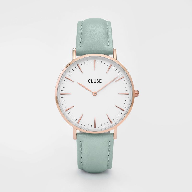 4. Une montre cluse or rose et cuir vert menthe : 89€95.