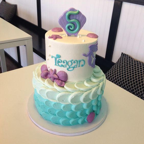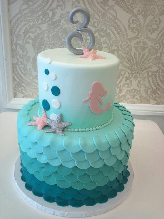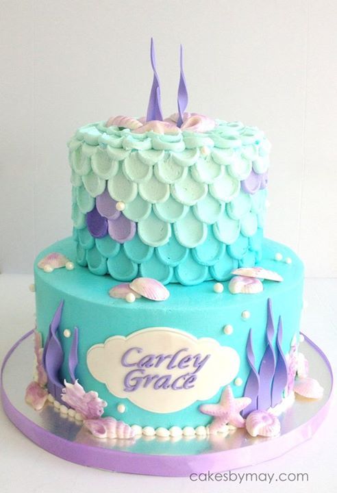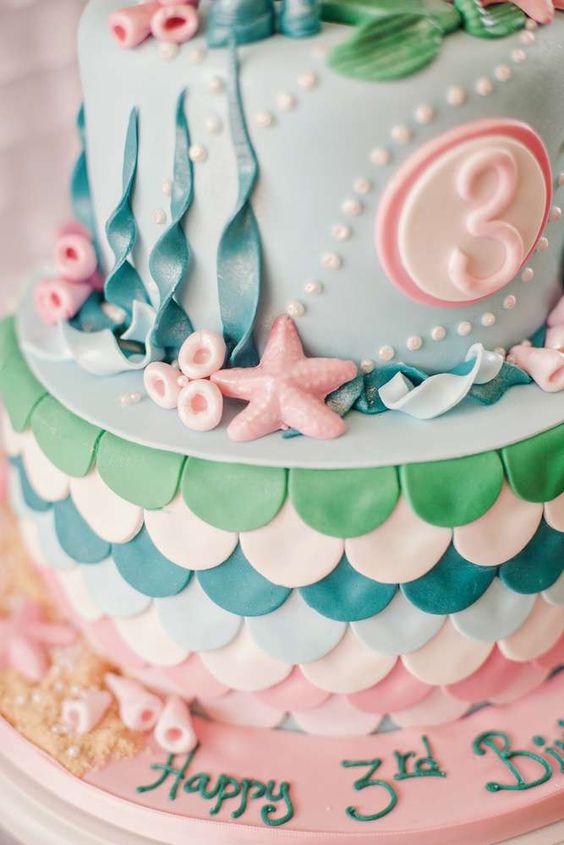 Tout d’abord, voici quelques unes de mes inspirations pour la pièce centrale : le gâteau ! Comme j’ai investi dans des moules et du matériel pour l’anniversaire de Miniloute, je voudrais faire un gâteau en pâte à sucre à 2 étages là encore. Je voudrais que l’étage du bas soit recouvert d’écailles turquoise/rose/corail/violet et celui du haut plus lisse avec quelques détails comme des coraux ou des algues.