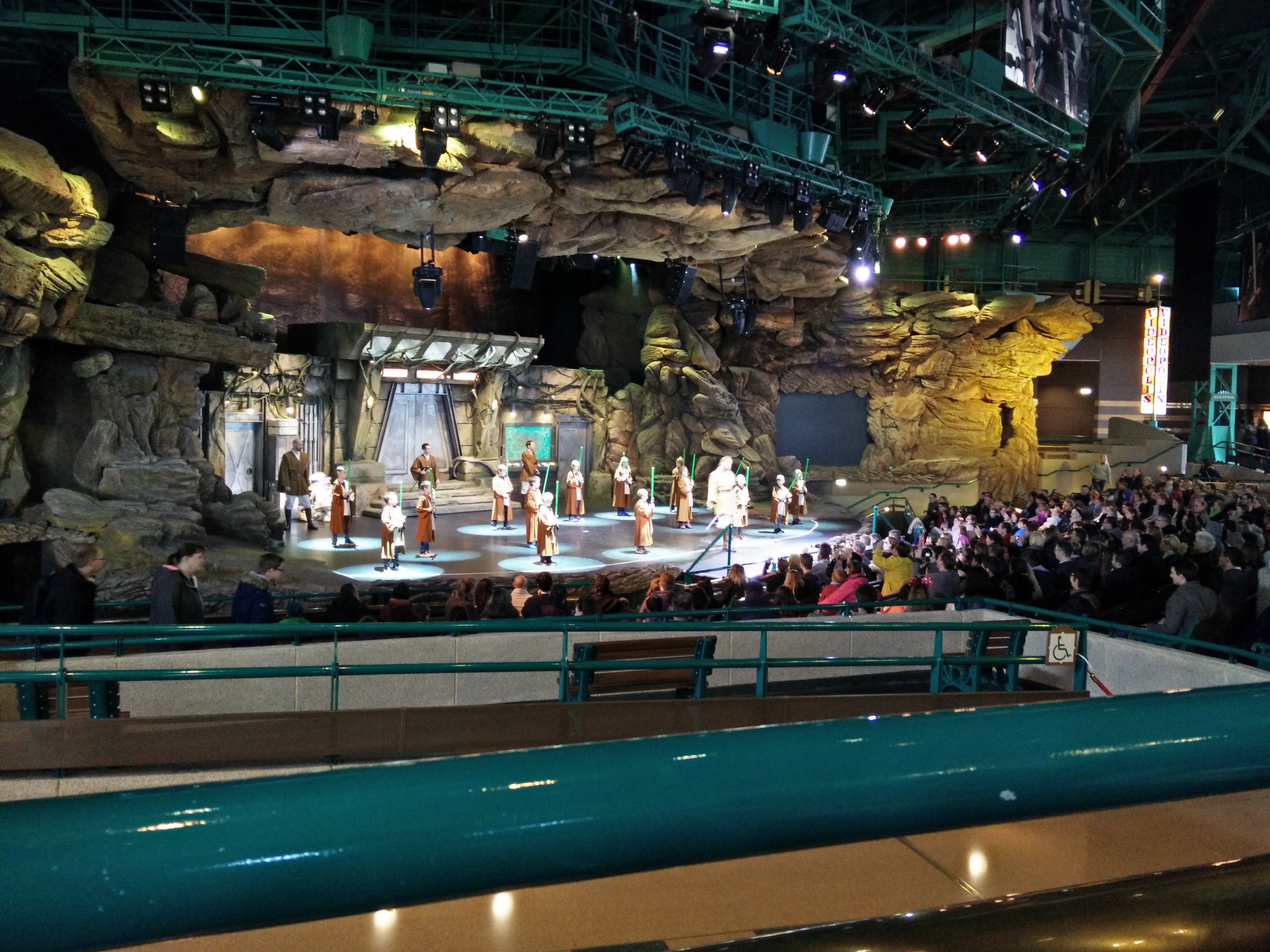 Comme dit plus haut, nous avons également pu voir La Jedi Academy depuis le restaurant Hyperion. Les parents des enfants sur scène étaient installés dans des gradins et les clients du restaurant juste au dessus. Un spectacle très sympa qui a lieu assez souvent à Vidéopolis, dans le monde de Discovery Land.