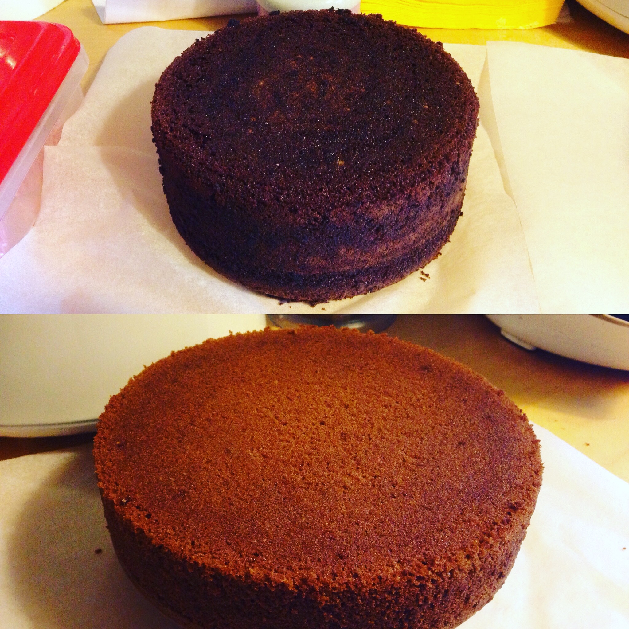 Le samedi matin j’ai pu finir mon gâteau avant 10 heures, un exploit pour moi ! Il faut dire que j’avais déjà bien avancé la veille et que mes modelages étaient déjà prêts, il ne restait qu’à les coller, sous la supervision de Liloute ! Le gâteau du bas est un sponge cake vanille fourré à la confiture de framboises et le gâteau du haut est un gâteau au chocolat fourré à la pâte de speculoos.