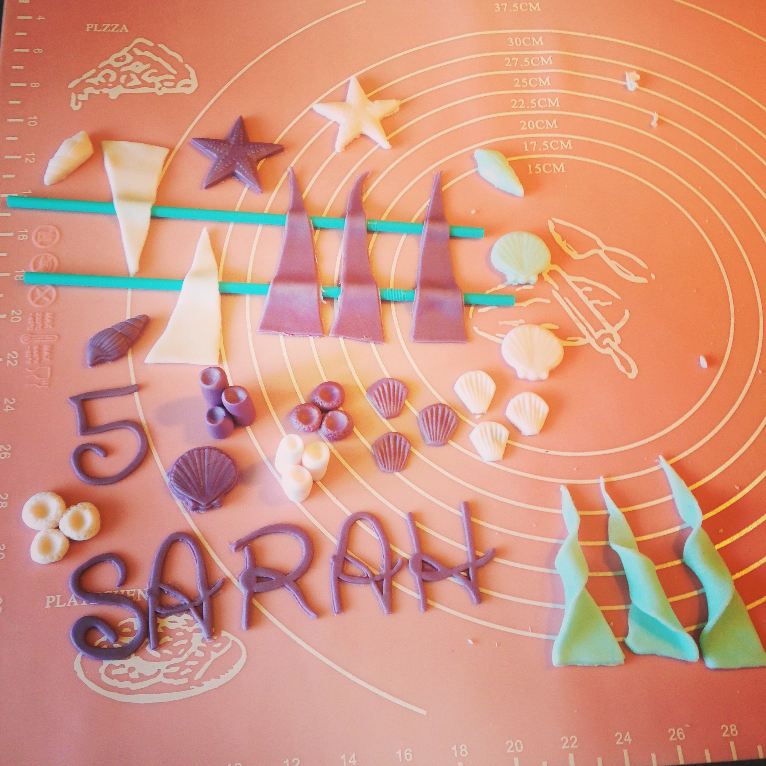 Je ne vous cache pas que ça a été très compliqué pour le gâteau… La pâte à sucre turquoise avait du avoir un souci lors du stockage ou du transport, car elle était très collante, trop humide (ou fondue, je ne sais toujours pas) et ça a été un vrai défi de recouvrir mes deux gâteaux ! De plus, mon gâteau du bas s’est avéré être un peu trop penché et celui du haut menaçait de s’y enfoncer voire de s’effondrer d’ici le lendemain après midi… Heureusement, monsieur m’a beaucoup aidée et a eu l’idée de rajouter des supports en bois sous le petit gâteau (j’en avais mis 4, comme d’habitude, mais là il en a fallu 6 !) pour qu’il soit bien stable et que le résultat soit bien plus harmonieux.