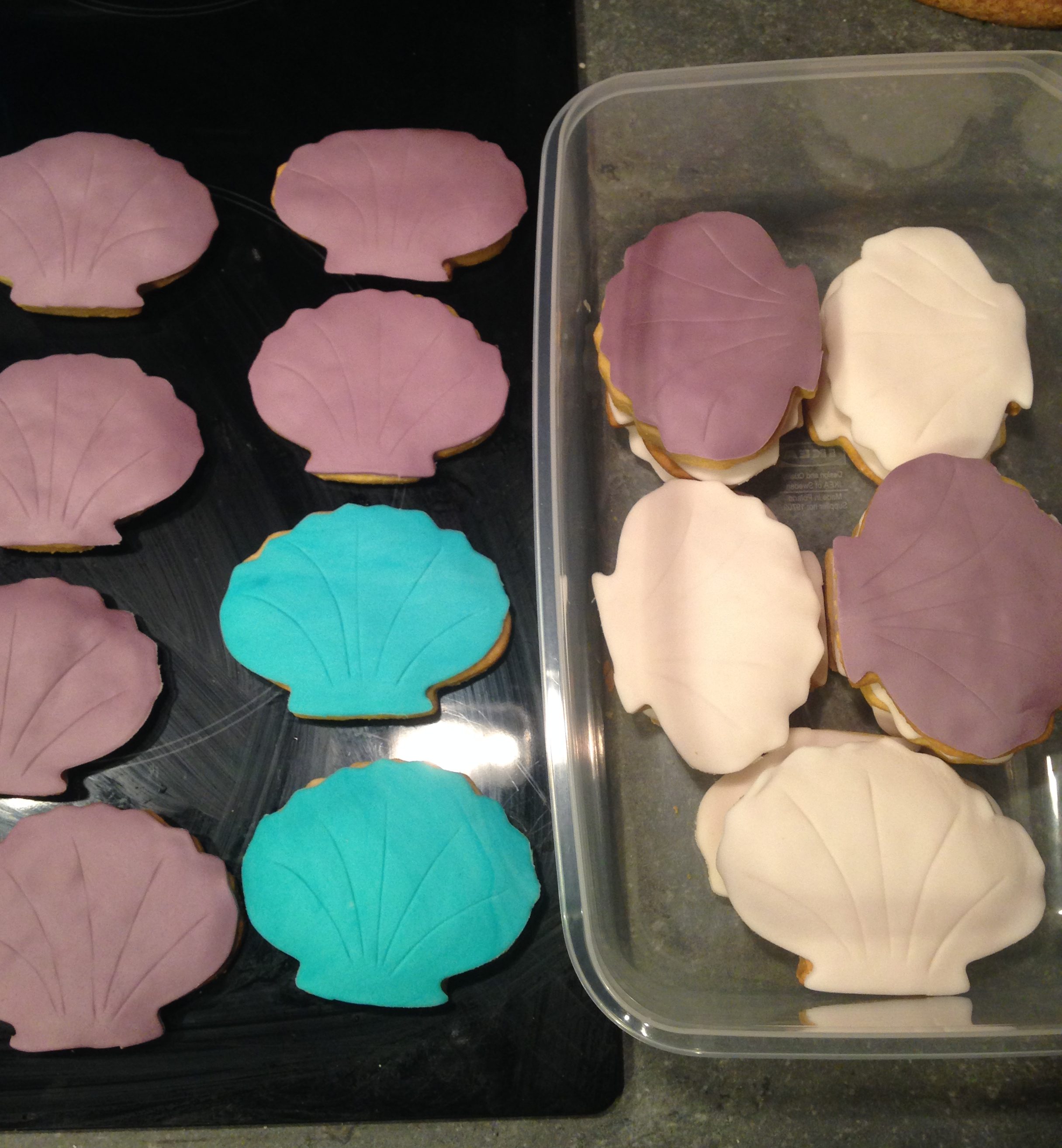 Les sablés coquillages ont assez mal supporté le stockage (forcément, sans papier cuisson entre les couches de pâte à sucre…) et se sont tous collés. Heureusement, grâce à l’aide de la super marraine de Liloute on a pu s’en sortir <3
