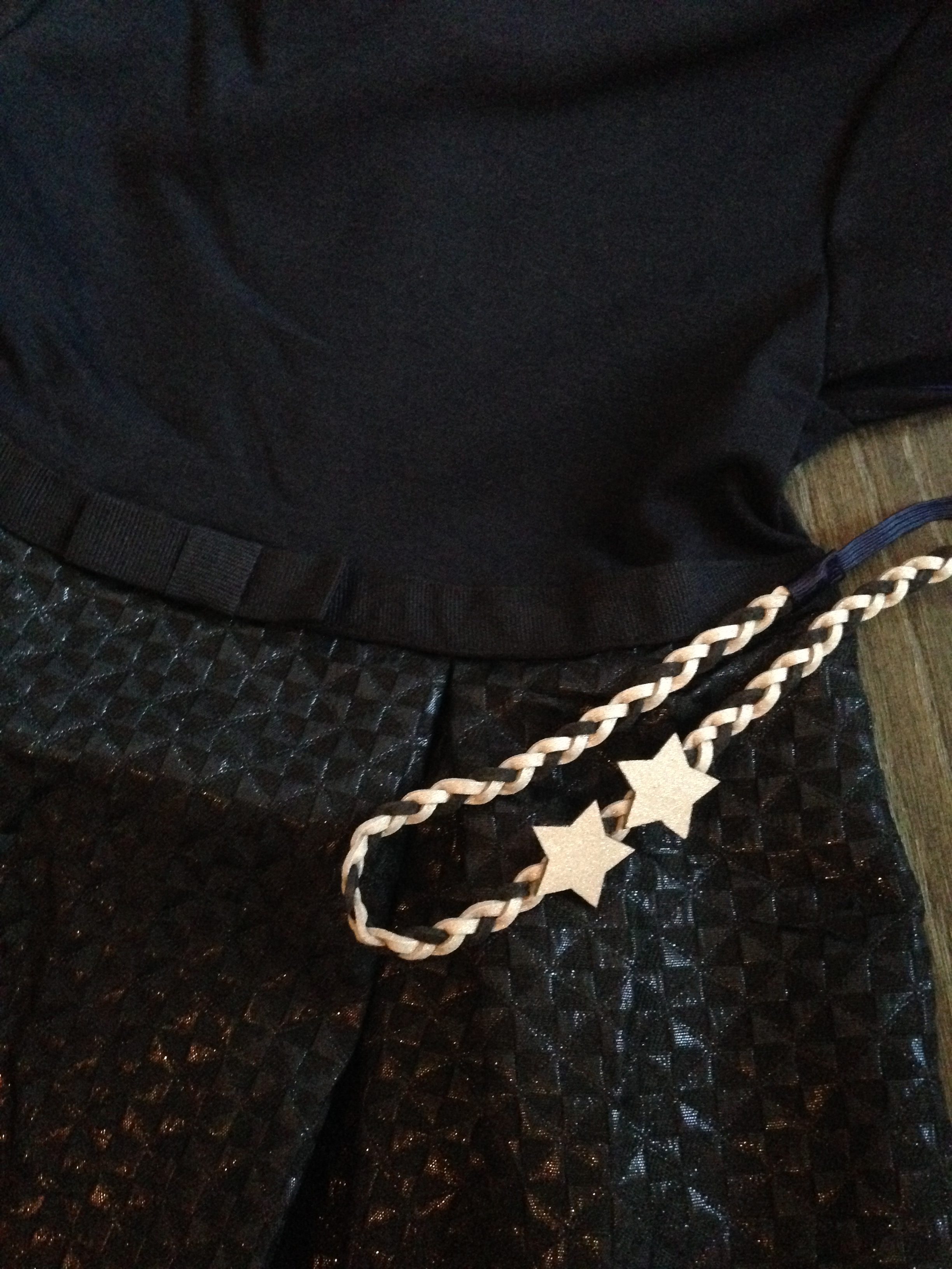 Pour ma grande, j’ai commandé du 5 ans, sa taille habituelle. Si au déballage j’ai trouvé cela un peu petit, c’est finalement pile ce qui lui faut pour Noël cette année. Et dans 2 ans sa soeur pourra mettre cette jolie robe pour les fêtes ! La matière du haut est assez épaisse, ce qui me rassure car j’avais peur qu’elle soit trop légère. A voir si j’achète un sous pull col roulé pour mettre en dessous ou si un bon gilet suffira. J’aime beaucoup les collants gris chiné irisé, qu’elle pourra remettre sans soucis et qui sont juste assez brillants pour Noël sans en faire trop. Enfin, le détail au top : le headband tressé à étoiles vraiment raccord avec sa tenue.