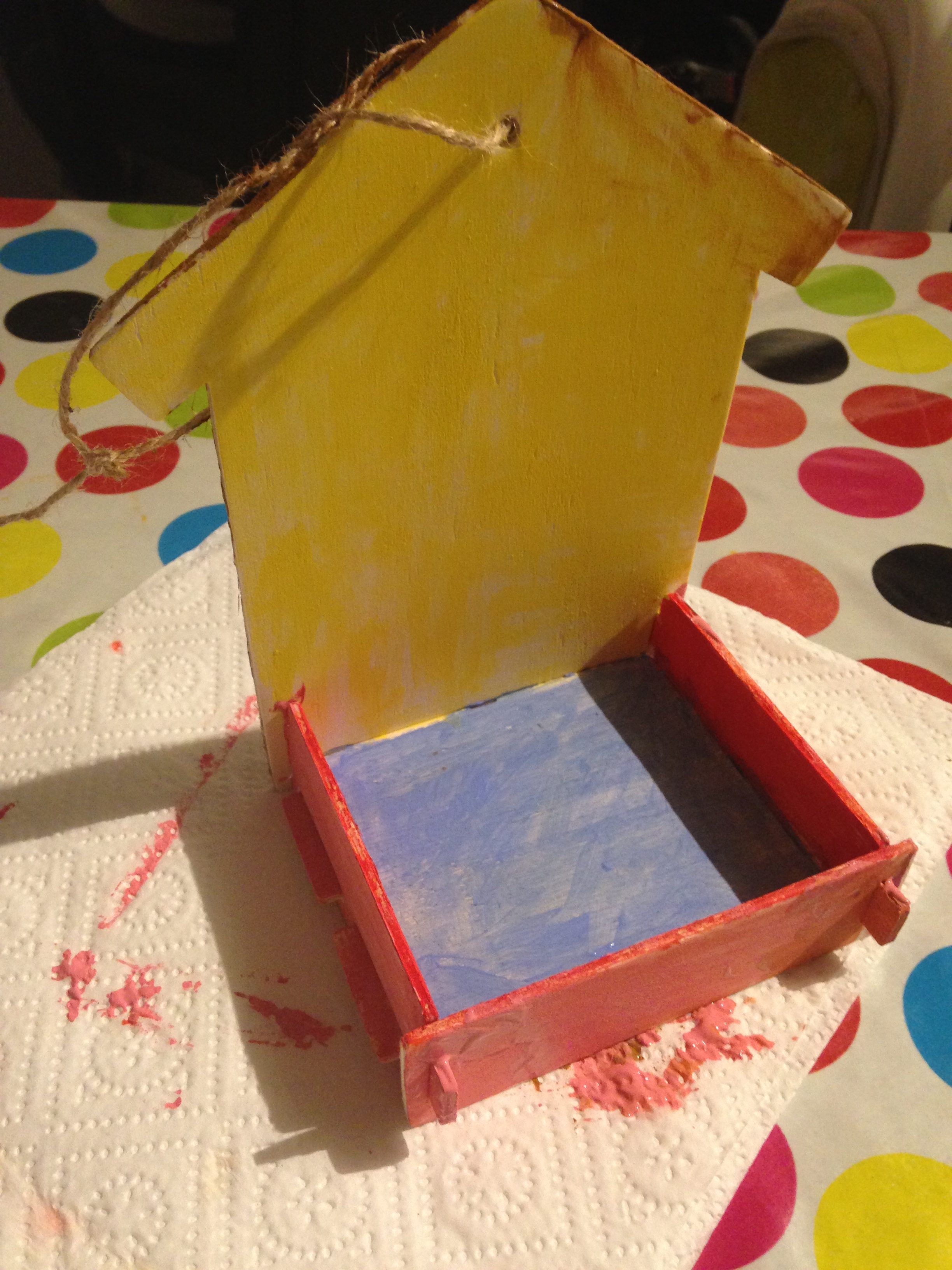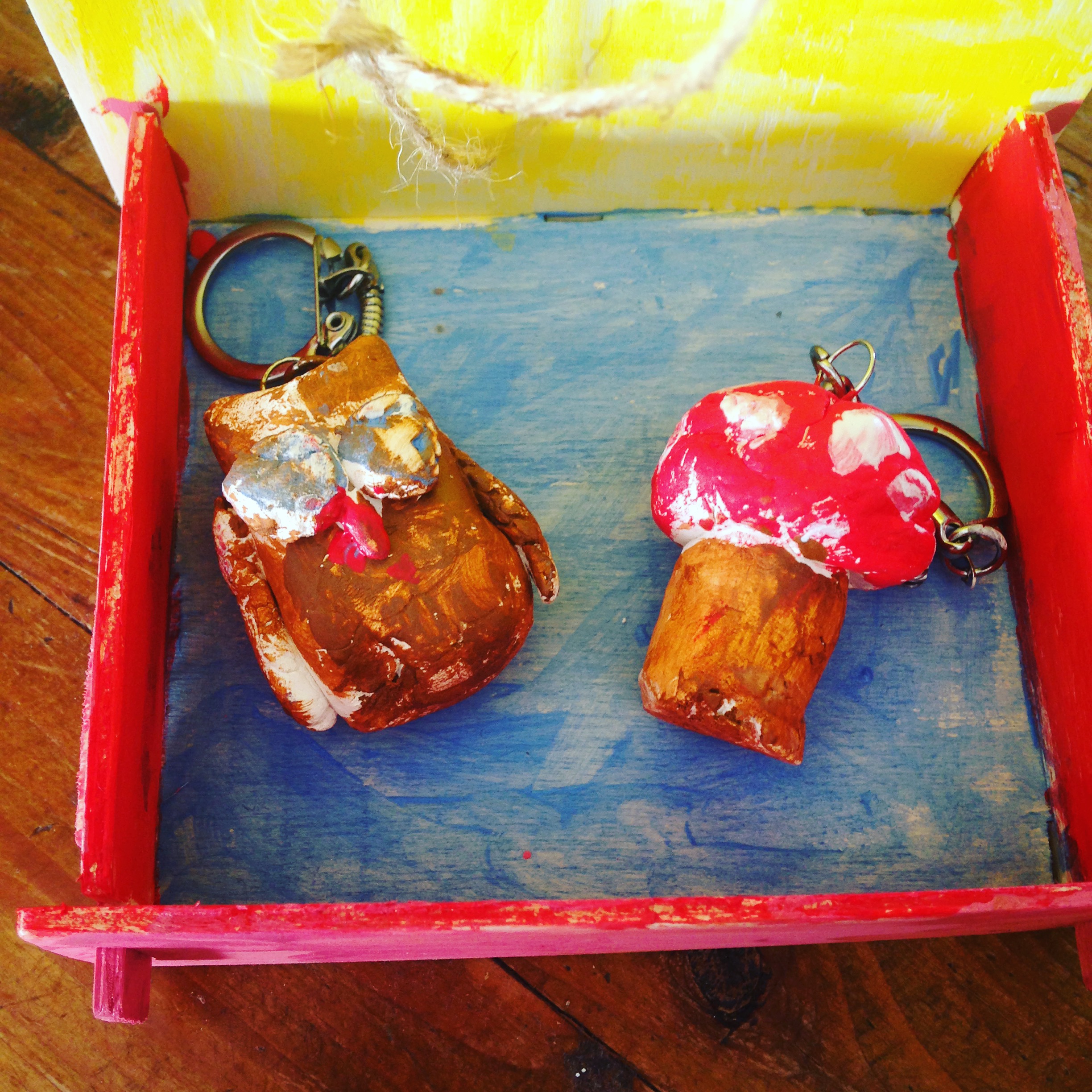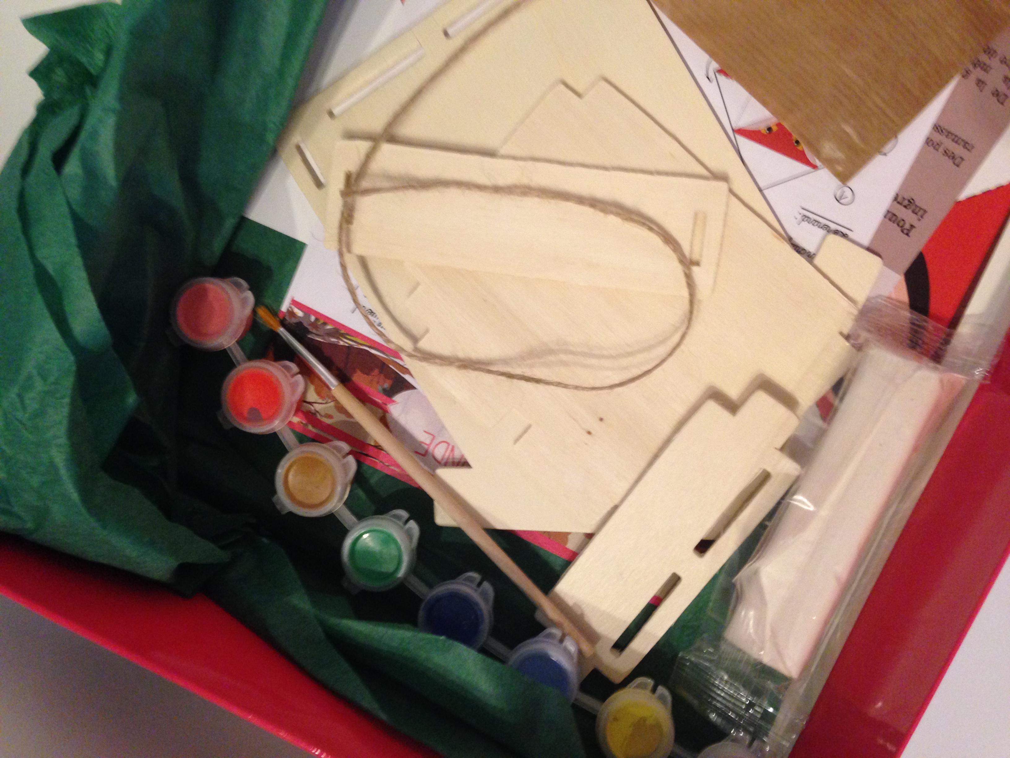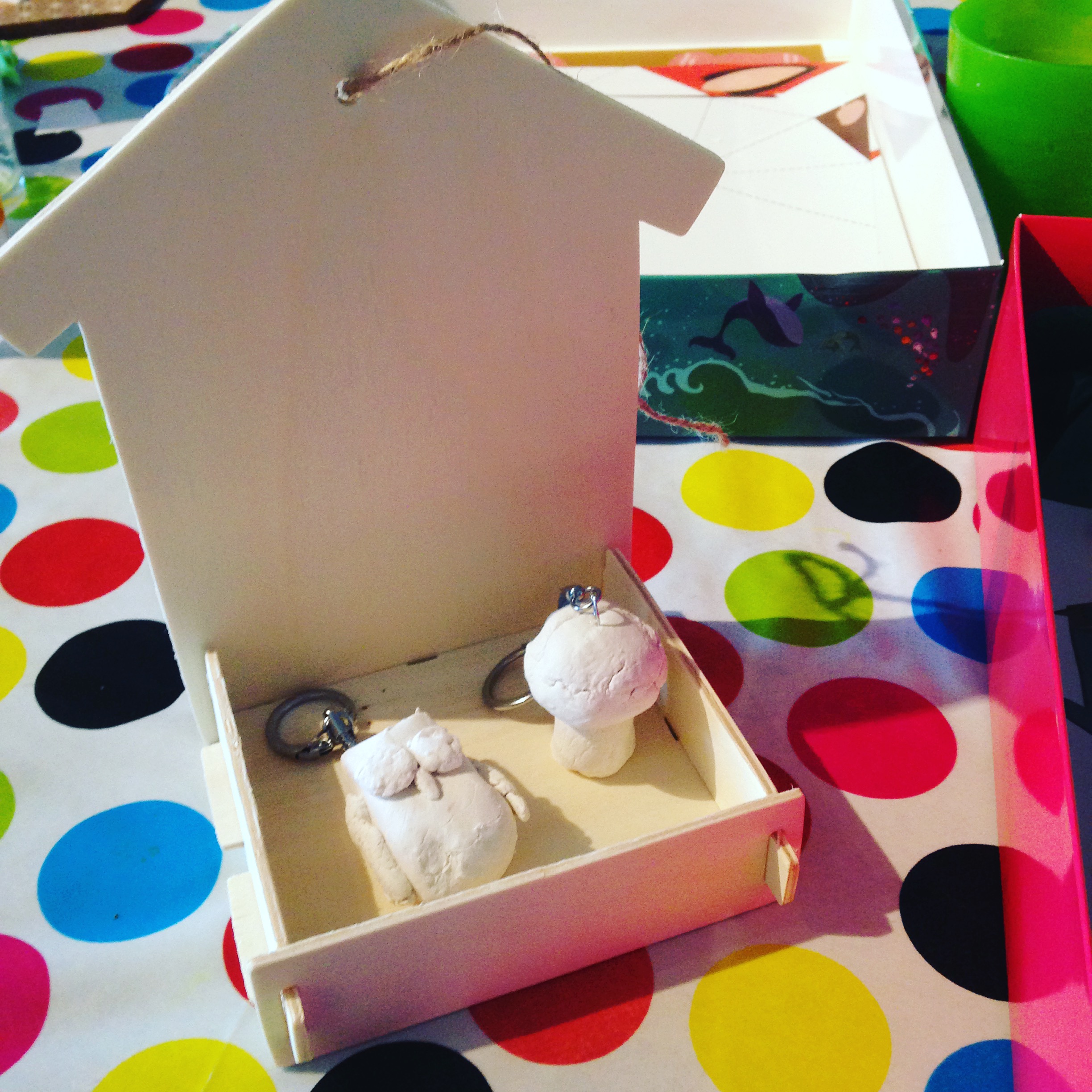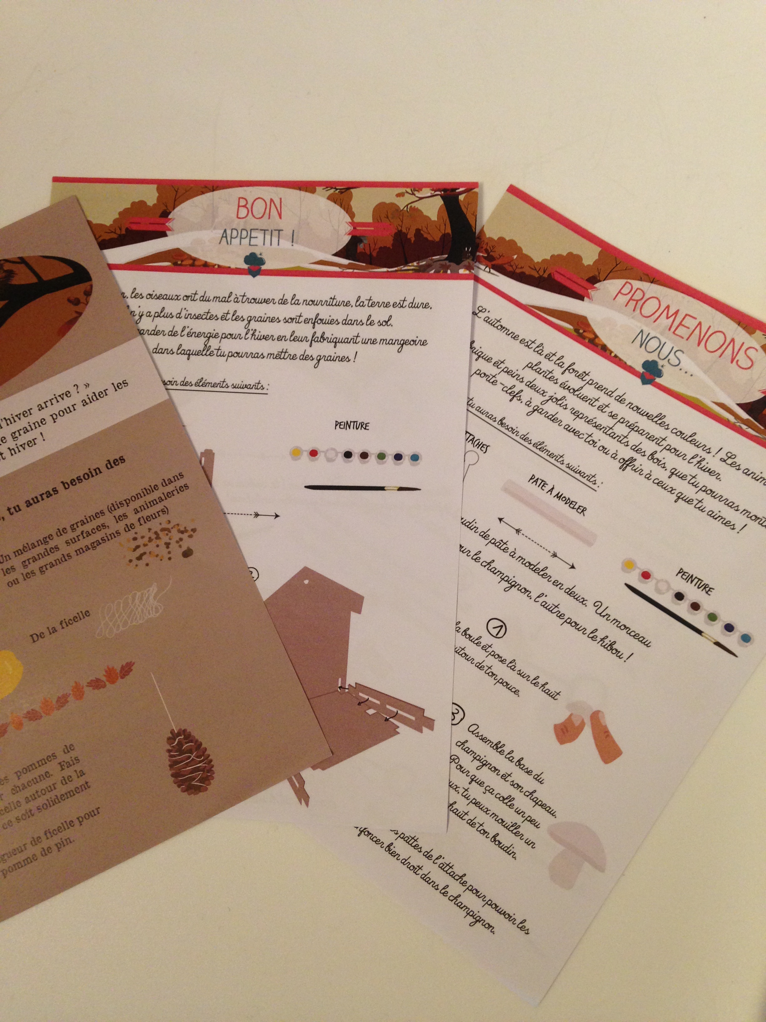 Liloute a beaucoup aimé l’activité porte clés et mangeoire en bois. Elle a un peu moins apprécié les origamis (moi, j’ai bien aimé :p) car il fallait s’appliquer pour faire les plis. Pour info, elle a 5 ans et a encore parfois du mal avec ce qui nécessite de la patience et de la minutie, même si cette activité était adaptée à son âge. Elle m’a bien aidée à façonner le champignon et la chouette en pâte durcissante (celle ci était encore plus dure à travailler que la nôtre, mais il fallait d’abord l’humidifier un peu) mais ce qu’elle a préféré c’était la peinture ! Pour la mangeoire elle m’a indiqué où peindre certaines parties et en quelle couleur, pendant qu’elle en peignait d’autres. Et c’est elle qui a entièrement peint les porte clés ! Elle qui n’a pas de gouache à la maison, elle a beaucoup apprécié ce type de peinture et je pense lui en racheter plus tard.