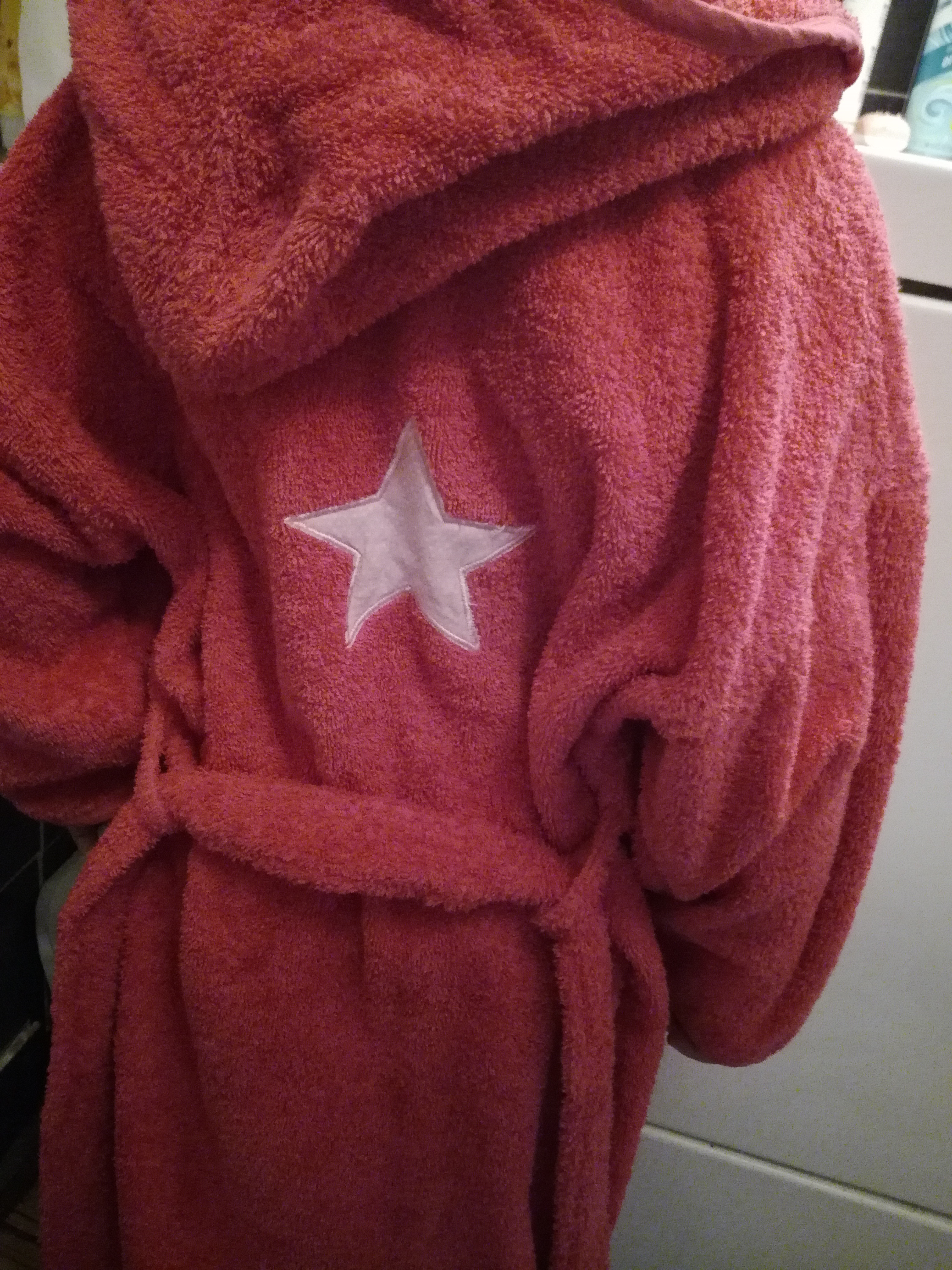 Je recherchais un peignoir vraiment absorbant et non en polaire, pour bien sécher ma fille après le bain. Celui-là est parfait, bien épais et pas rèche, avec une ceinture suffisante pour le fermer mais pas trop longue non plus (ma fille étant menue, il y avait un risque de ceinture qui traine par terre : il n’en est rien !). Elle adore la couleur, c’est elle qui avait choisi le modèle et le coloris d’ailleurs… Rose, que c’est étonnant !
