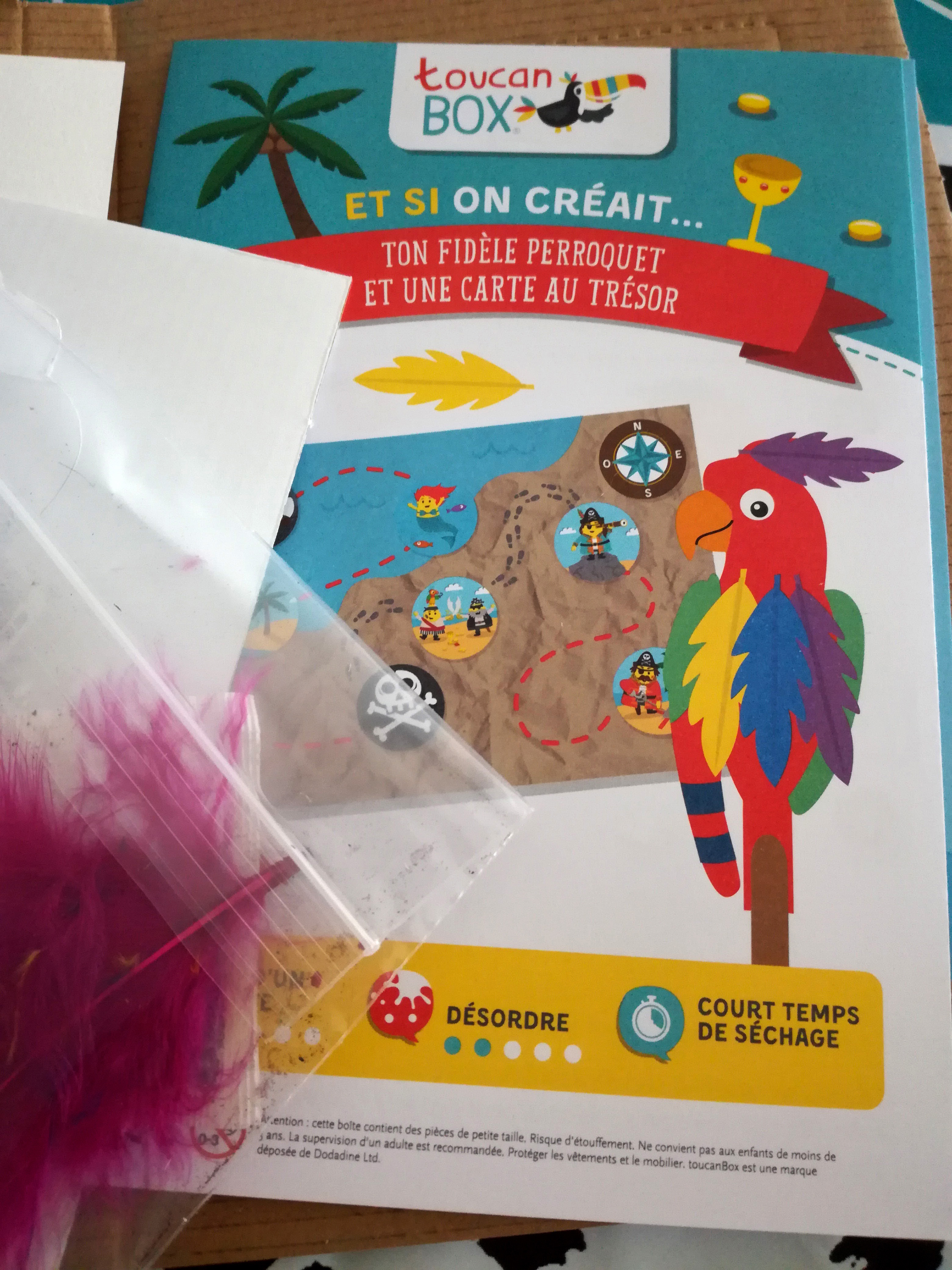 Si vous me connaissez un peu, vous saurez que j’ai beaucoup de mal à laisser mes enfants faire seuls et lâcher prise. C’est donc un bon entraînement pour moi aussi ! Liloute a beaucoup aimé cette box très complète et j’avoue que je suis fan moi aussi. Elle a réalisé seule son perroquet et la carte au trésor. J’ai adoré l’idée du sachet de thé dans l’eau pour vieillir le papier, le fait de froisser la feuille au préalable, et le faible temps de séchage ! Elle a pu faire tranquillement son activité perroquet pendant que la carte séchait et utilise encore les fournitures pour ses dessins et autres activités.