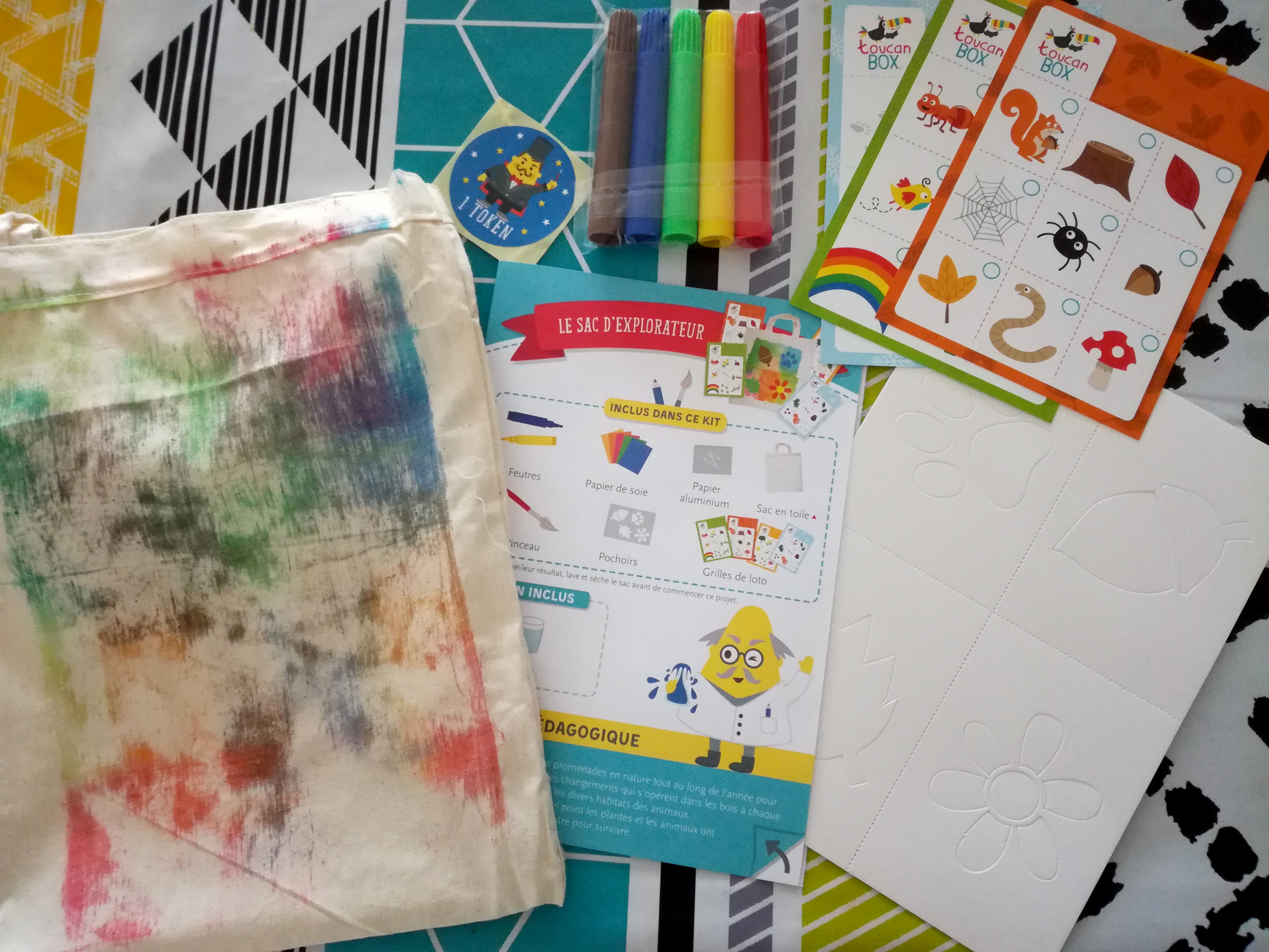 Ma petite dernière n’était pas en reste puisqu’elle a reçu un kit sur le thème de la nature. A l’intérieur, de quoi réaliser un sac d’explorateur en tissu, parfait pour ramasser des feuilles mortes, marrons et glands lors de nos balades automnales ! Encore une fois, le kit était hyper complet : pinceau, feutres, pochoirs, papier de soie, la seule chose à ajouter était un verre d’eau !