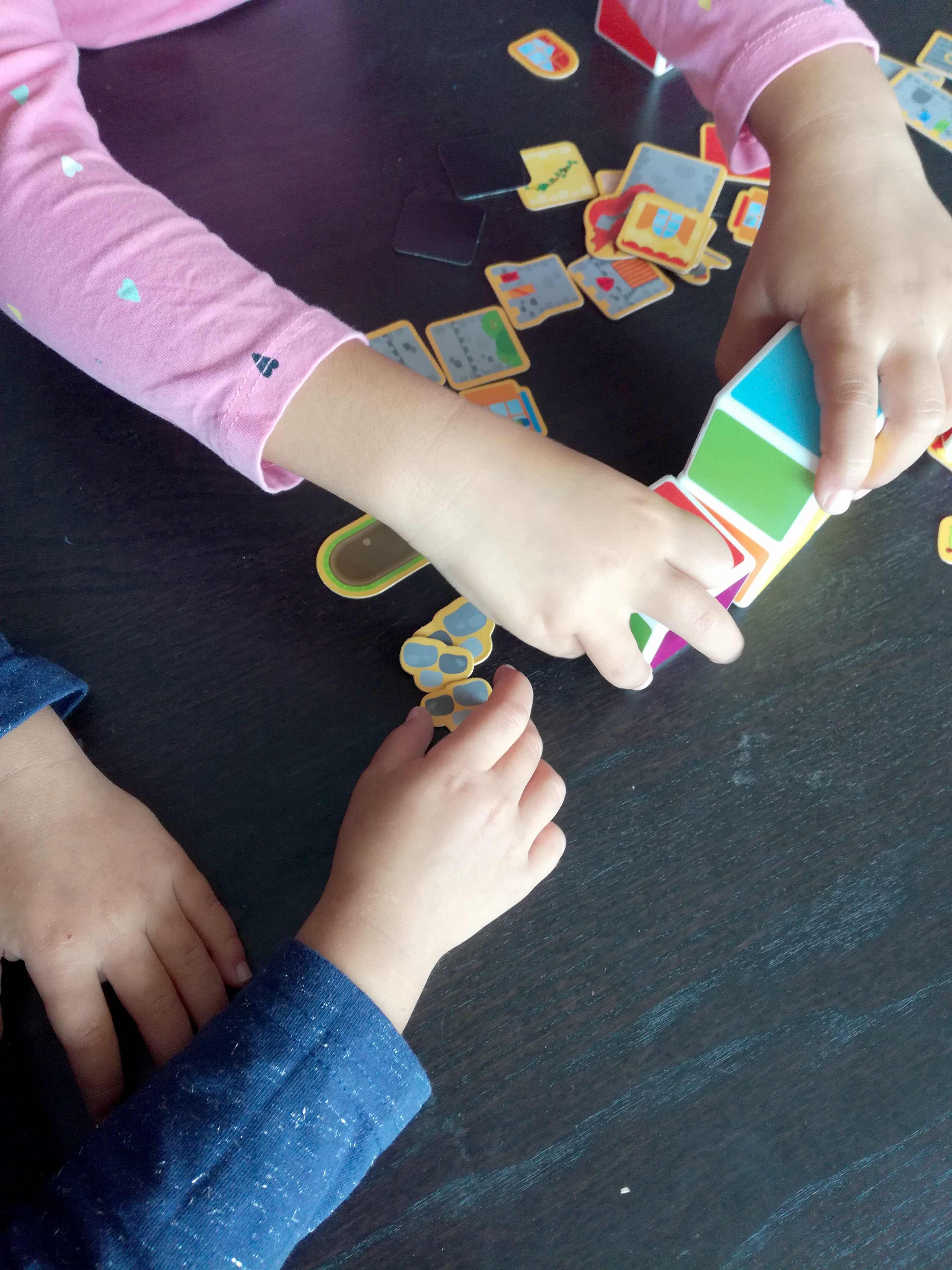 Nous avons donc testé le coffret Châteaux et Maisons, qui comprend 16 cubes magnétiques et 62 magic clips. Les filles ont poussé de grands « woah » dès l’ouverture et ont tout de suite compris le fonctionnement du jeu. Liloute a décollé elle même toute une planche de Magic Clips tandis que je galèrais avec la mienne (il m’a fallu du temps avant de comprendre comment défaire les clips, du coup certains sont déchirés) et Miniloute a longtemps joué rien qu’avec les cubes, fascinée par le côté magnétique !
