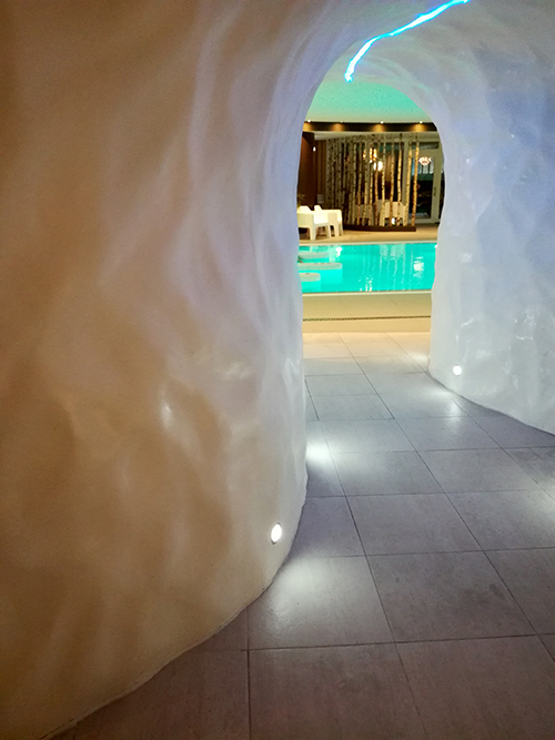Au centre de l’univers sensoriel, le bassin propose un parcours avec différents jets, une banquette hydromassante et des lames d’eau, le tout avec un petit côté luminothérapie avec des éclairages de couleurs différentes. La température de l’eau est idéale, en grande frileuse je n’ai eu aucun mal à entrer dans le bassin !