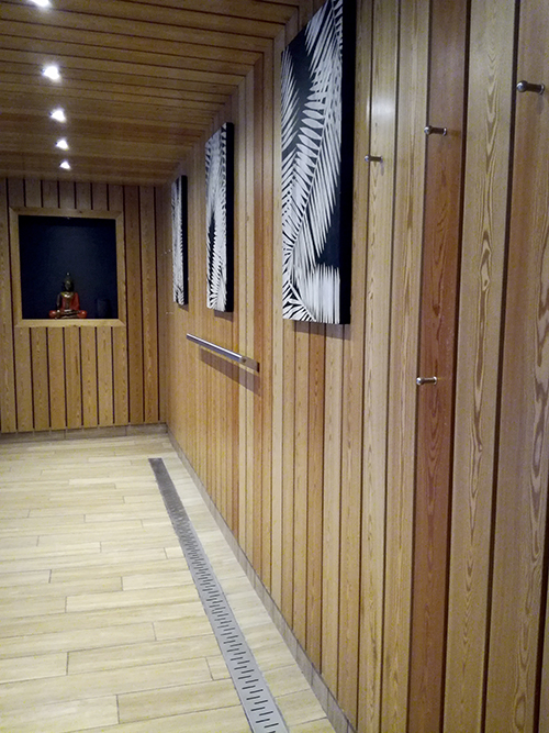 En sortant des vestiaires on peut soit accéder à l’espace soins par un couloir soit se reposer dans l’espace lounge/tisanerie au design naturel avec vue sur un petit patio. Vous pourrez ensuite entrer dans l’espace sensoriel en lui même via un sas avec douches et pédiluve.