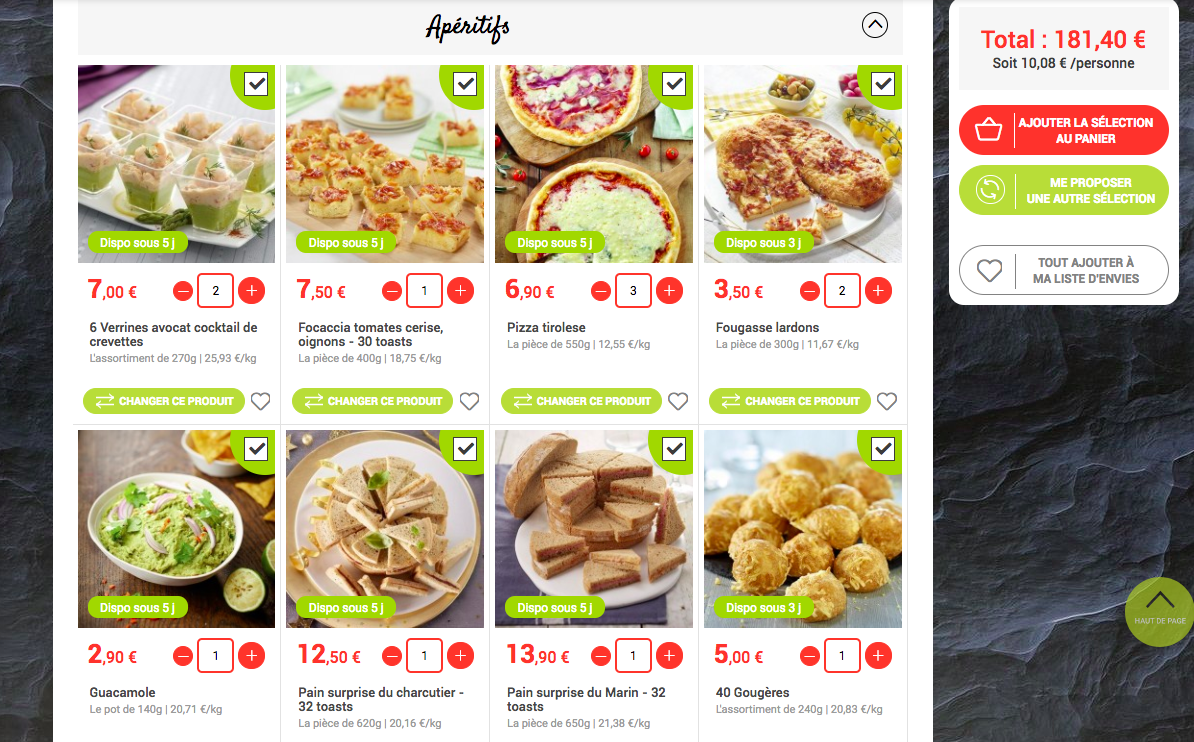 Le principe est simple : vous sélectionnez votre type de réception, le nombre d’invités (adultes et enfants), votre budget par personne. J’ai testé une recherche pour un apéro dinatoire avec 6 adultes et 12 enfants, avec un budget entre 7 et 13 euros par personne, et j’ai obtenu une sélection de produits avec en bonus des suggestions de plateaux et desserts dans mon budget.
