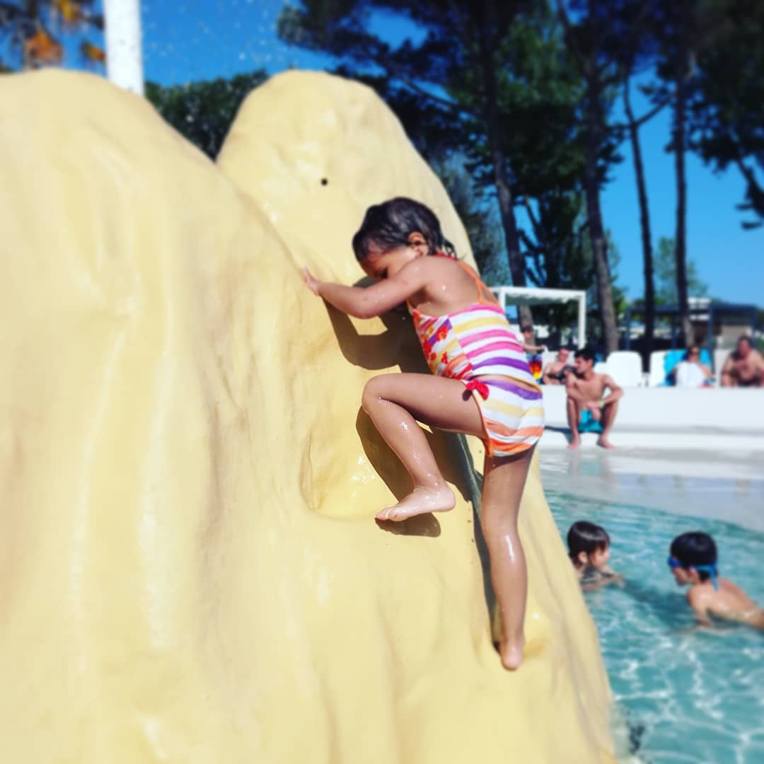 Si vous nous suivez sur instagram, vous avez peut-être vu en story certaines parties du camping et nombre d’entre vous avez flashé sur la pateaugoire de l’espace aquatique : j’avoue, pour nous c’était le gros point fort ! Tellement qu’on a passé 3 à 4 journées dans le camping sans en sortir, juste en profitant de la piscine et en laissant les filles jouer dans notre allée. La mer étant très froide, nous n’y sommes allés que 2 fois sur la semaine, mais les filles ont adoré jouer dans le sable et l’accès à cette superbe plage de sable fin presque exclusive au camping est un autre point fort du camping du Castellas.
