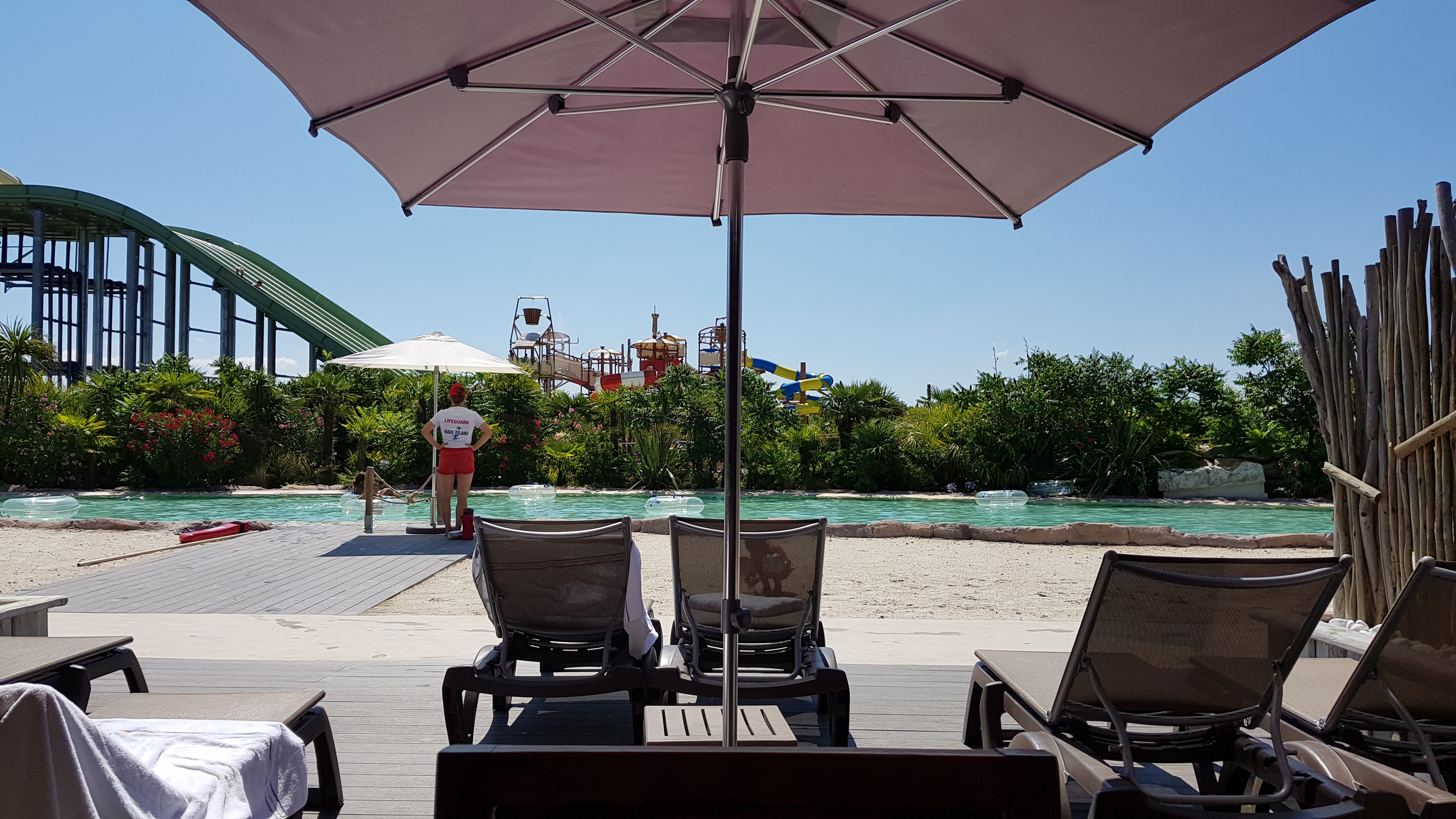 Nous avons pour notre part choisi une paillote située juste en face de l’escalier pour accéder à la rivière. Avec la réservation de votre paillote, vous avez un bracelet coupe file pour les attractions à sensation (à partir d’1m20), des transats, un parasol, une armoire (pas besoin de prendre un casier), une table et des chaises, des serviettes (1 par personne) et la possibilité de vous faire livrer votre repas directement en paillote.