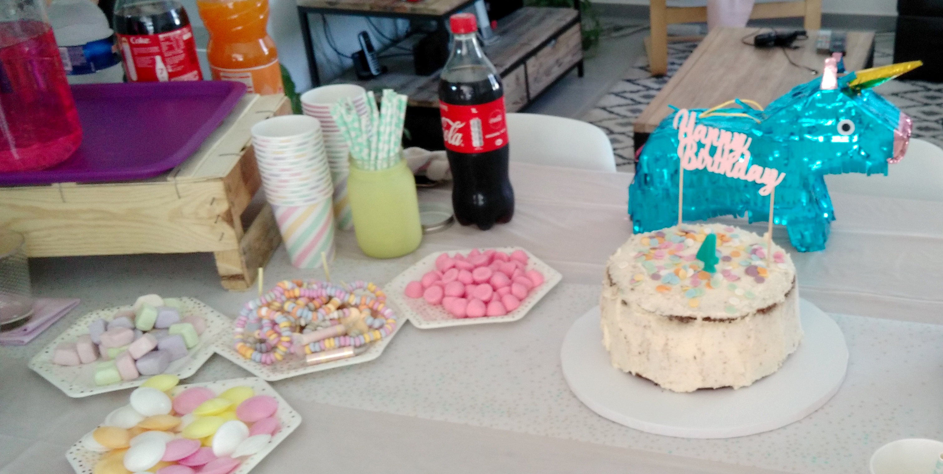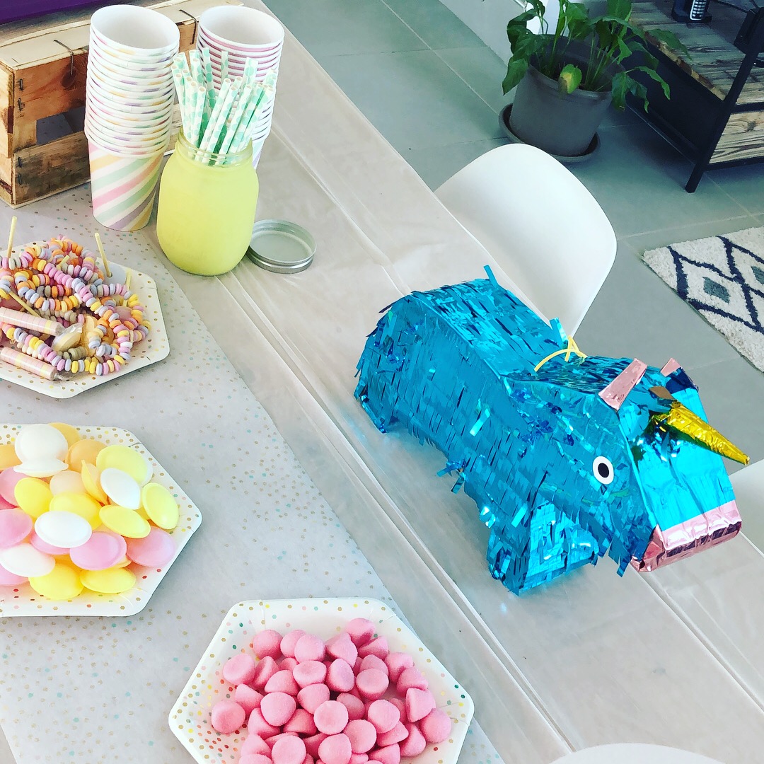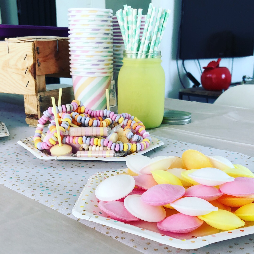 J’ai acheté des soucoupes et autres bonbons un peu régressifs (les colliers de bonbons, les guimauves artisanales…) qui allaient super bien avec les couleurs douces du thème, on a coloré de la limonade en rose pour la mettre dans la fontaine à boissons (que je ressors à chaque anniversaire depuis le baptême civil champêtre des filles), entreposé les cupackes sur un présentoir blanc (astuce : réutiliser un présentoir en carton Hema du côté non utilisé, ici celui de l’anniversaire Vaiana d’octobre dernier qui a une face colorée et une face blanche !), mis les pailles et couverts dans une jolie jar jaune pâle gardée pour l’occasion et accroché la guirlande vegaooparty. La pinata Hema trouvée en soldes a d’abord été utilisée pour décorer la sweet table avant d’être accrochée à l’extérieur pour que les enfants la tapent ! D’ailleurs, elle est très dure à détruire, prévoyez plutôt d’accrocher des fils en dessous et de faire une ouverture au préalable…